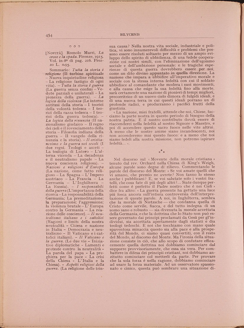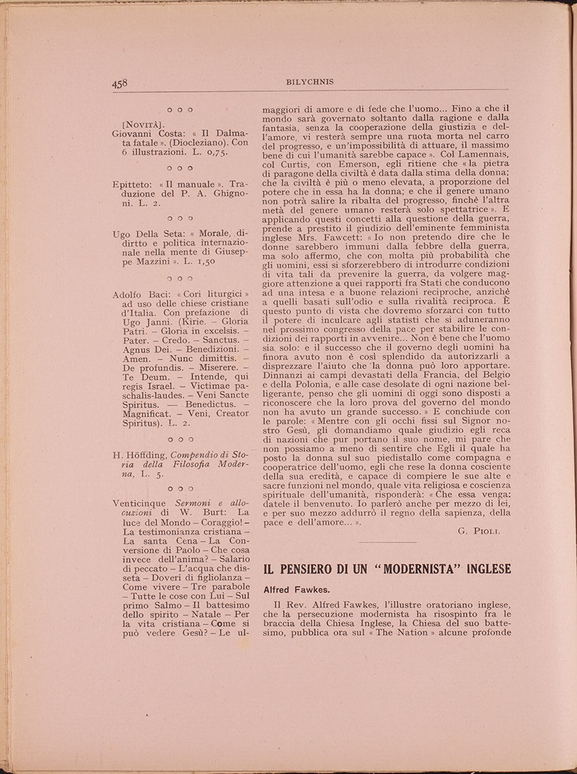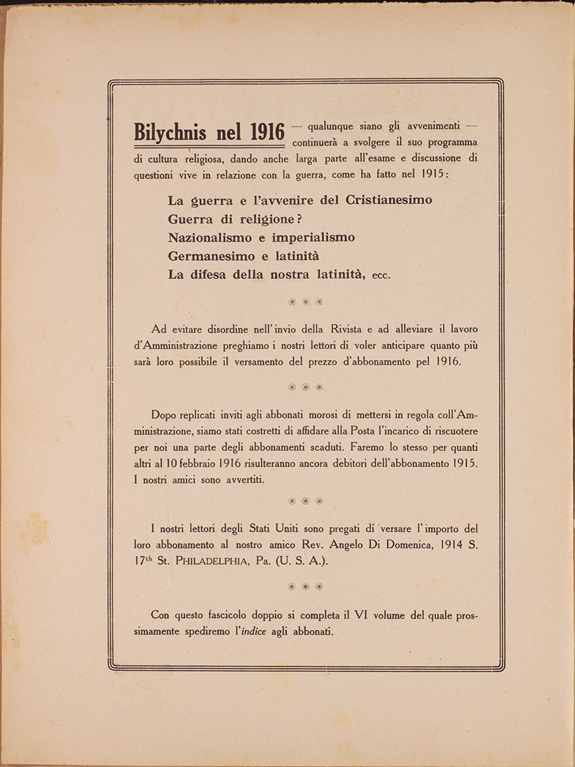 Sollecitare le prenotazioni, inviando cartolina-vaglia alla Casa di studio, Gualdo (Macerata) od alla amministrazione di Bilychnis, Via Crescenzio, 2, Roma.