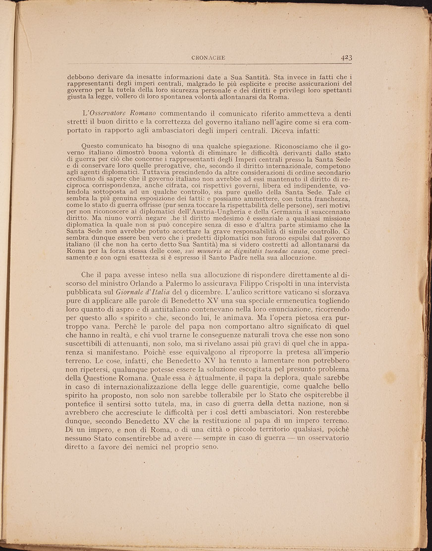 « La guerra presente offre alla Chiesa Romana una opportunità unica, giacché con lo sfacelo dell’impero Austro Ungarico, la sua forza coercitiva sarà ridotta notevolmente; la sua potenza politica sarà ridotta ai minimi termini; ed essa sarà sospinta ad appoggiarsi soltanto sulla persuasione, anziché sulla forza. L’occasione sarà splendida; e se Benedetto XV saprà afferrarla, il suo nome passerà alla storia come quello di uno dei più grandi Papi. Si tratterà di un’opportunità di infondere nella Chiesa un nuovo spirito di tolleranza; di abbandonare per sempre quelle ambizioni politiche che si sono mostrate già nel passato come un’insidia e una delusione; di adattarsi al nuovo spirito dei tempi, e di mostrare che anche nella nuova èra in cui il mondo entrerà, vi è posto per una fede puerile e per uno spirito di sottomissione a un Dio Onnipotente. È facile descrivere quale dovrebbe essere la politica da adottare per il raggiungimento di questo fine: riconciliazione con l’Italia; atteggiamento più benevolo verso gli spiriti più liberali fra i figli della Chiesa; rinunzia a quei sistemi di conversione che hanno eccitato l’allarme e la sfiducia del genere umano. Non sembra troppo lo sperare che questa opportunità verrà colta, giacché nel passato la Chiesa Romana non ha mai mancato di trar profitto dalle crisi della sua storia...