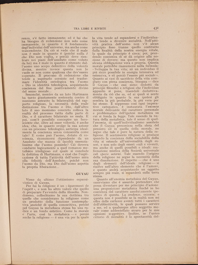 .E non ci ingannammo: e la partecipazione dell’Italia al conflitto ci offrirà mòdo di esaminare, in ultimo luogo, il delincarsi, nella guerra, medesima, nella disciplina morale e nelle virtù che essa suscita, nella reazione spirituale contro il germanesimo, l'inizio od alméno la speranza non vana di una profonda rinnovazione morale, la quale non avrebbe potuto non essere anche religiosa.