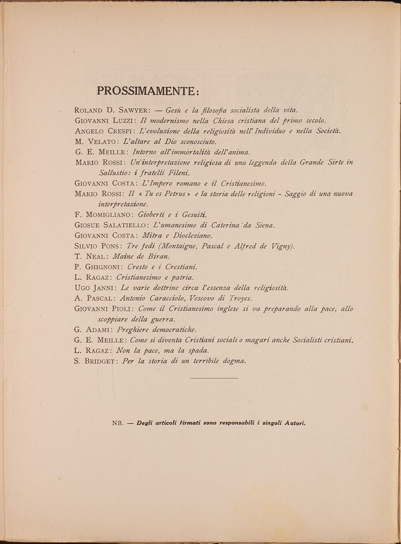 DAL SOMMARIO : Romolo MuRRI : Un programma di pontificato (Pio X). — GIOVANNI E. MeiLLE: Giovanni Jaurès. — EDMONDO GoUNELLE: La figura morale e spirituale di G. Jaurès Paolo PASCHETTO: II, seminatore (Disegno). — ANTONINO De STEFANO: Saggio sull’eresia medioevale nei secoli XII e XIII -ERNESTO RUTILI: La soppressione dei gesuiti nel 1773 nei versi inediti d’uno di essi. — J. E. ROBERTY : La porta aperta davanti ai Cristiani d’oggi. — GASTONE FROMMEL: La preghiera. — P. GHIGNONI: A proposito di Unione delle Chiese Cristiane. — SILVIO PONS: La nuova crociata dei bambini. — ANTONIO GALLOPPI: Storia del dogma.