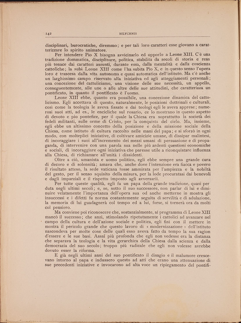 Per intendere Pio X bisogna avvicinarlo ed opporlo a Leone XIII. C’è una tradizione dommatica, disciplinare, politica, stabilita da secoli di storia e resa più tenace dai caratteri assunti, durante essa, dalla mentalità e dalla coscienza cattoliche; la subì Leone XIII come l’ha subita Pio X, e in questo senso l’opera loro è trascesa dalla vita autonoma e quasi automatica dell’istituto. Ma c’è anche un larghissimo campo riservato alla iniziativa ed agli atteggiamenti personali; una concezione del cattolicismo, una visione delle sue necessità, un appello, conseguentemente, alle une o alle altre delle sue attitudini, che caratterizza un pontificato, in quanto il pontificato è l’uomo.