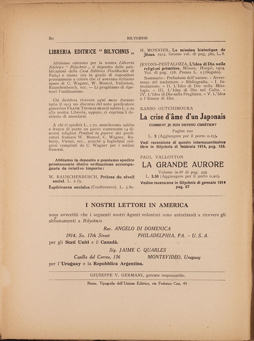Abbiamo ottenuto per la nostra Libreria Editrice " Bilychnis „ il deposito delle pubblicazioni della Casa Editrice Fischbacher di Paridi e siamo ora in grado di rispondere prontamente a coloro che ci avevano richiesto opere di C. Wagner, W. Monod, Vallotton, Rauschenbusch, ecc. — Li preghiamo di ripeterci l'ordinazione.