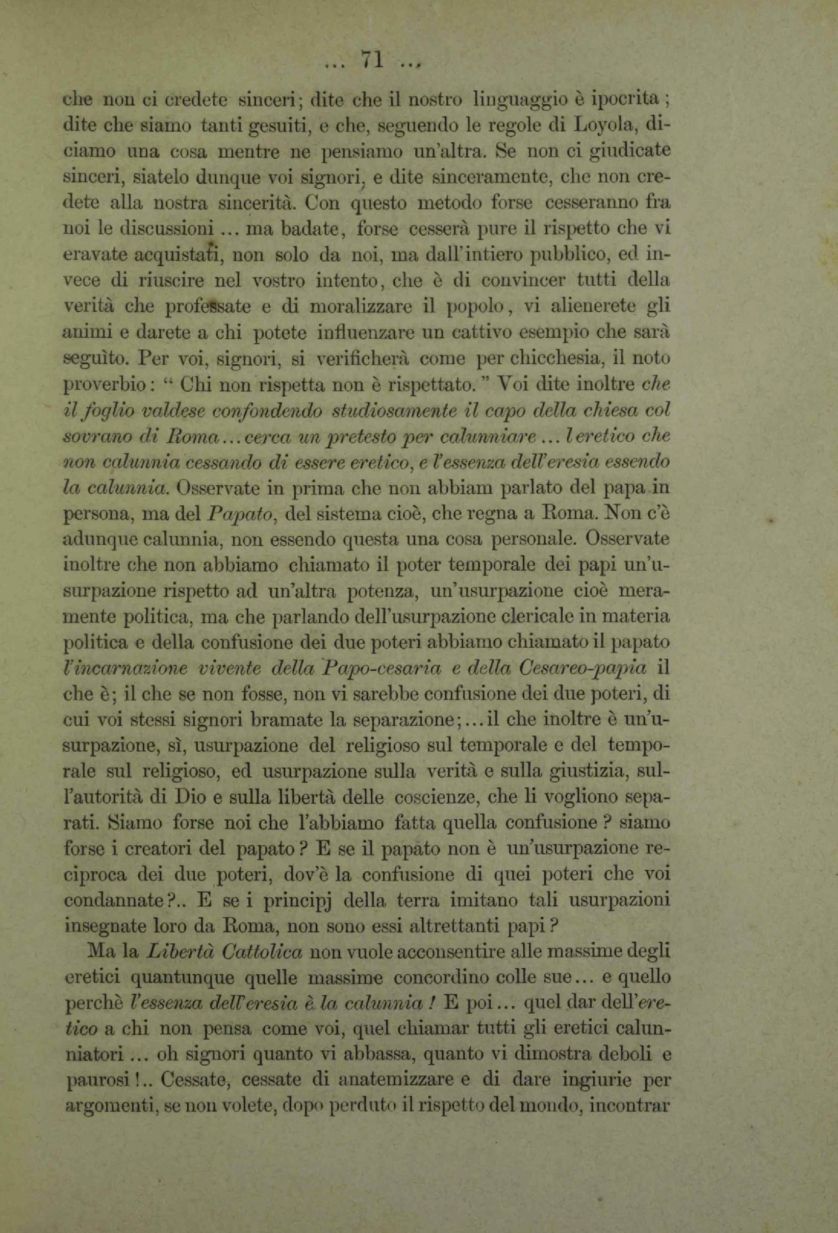 Meglio fece, a parer nostro, il vescovo di Pinerolo, Monsignor Eenaldi, che nella sua lettera pastorale publicata in simile circostanza .