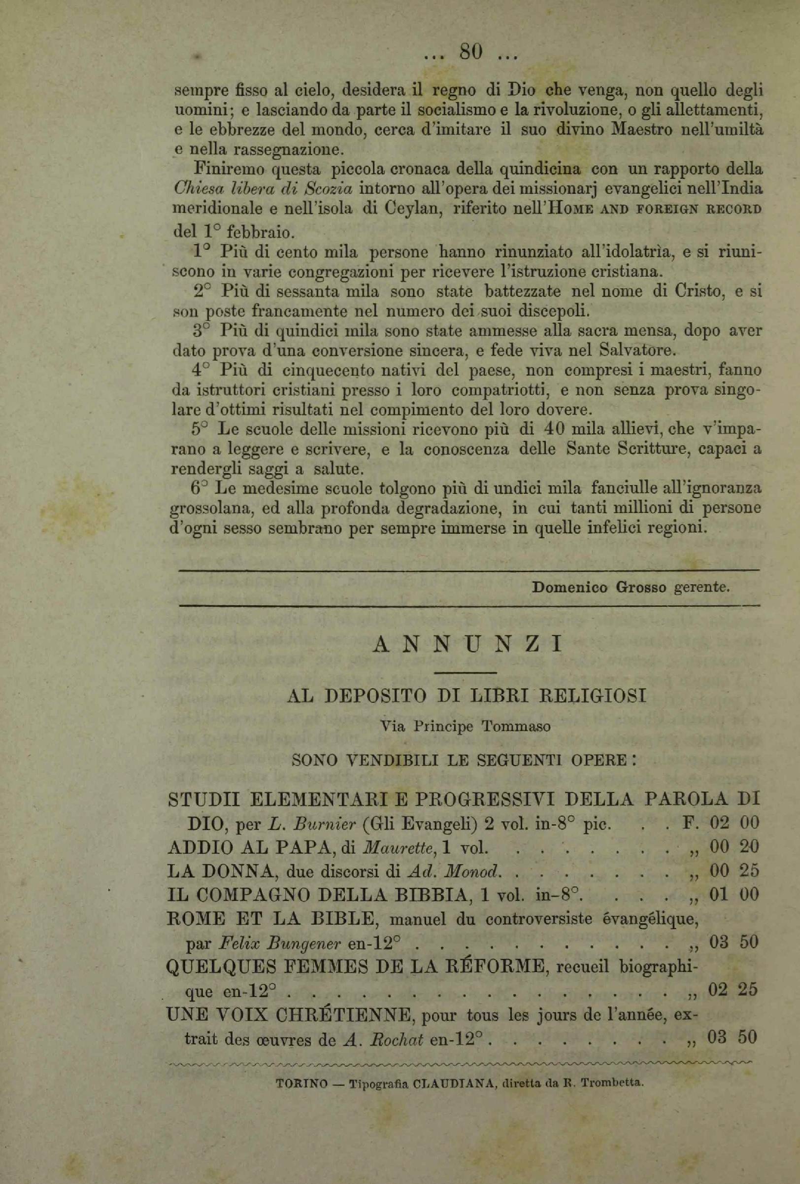 Chiesa libera di Scozia intorno all’opera dei missionarj evangelici nell’india
