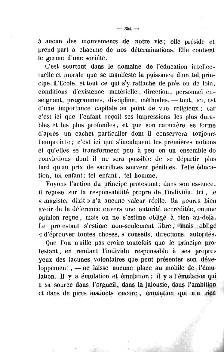 également dans l’éducation proprement dite. Pour le protestant, l’éducation n'est pas uniforme , collective, impersonnelle ; elle repose moins sur des dispositions réglementaires que sur des principes écrits au fond de la conscience