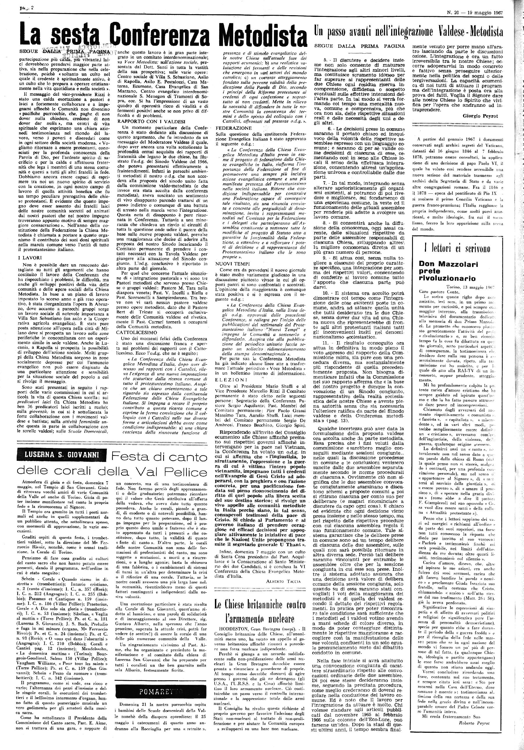 1 Anno XCVII - N. 20 .ABBONAMENTI f Eco: L. 2.500 per l’interno Spedizione in abbonamento postale . I Gruppo bis TORRE PELLICE — 19 Maggio 1967