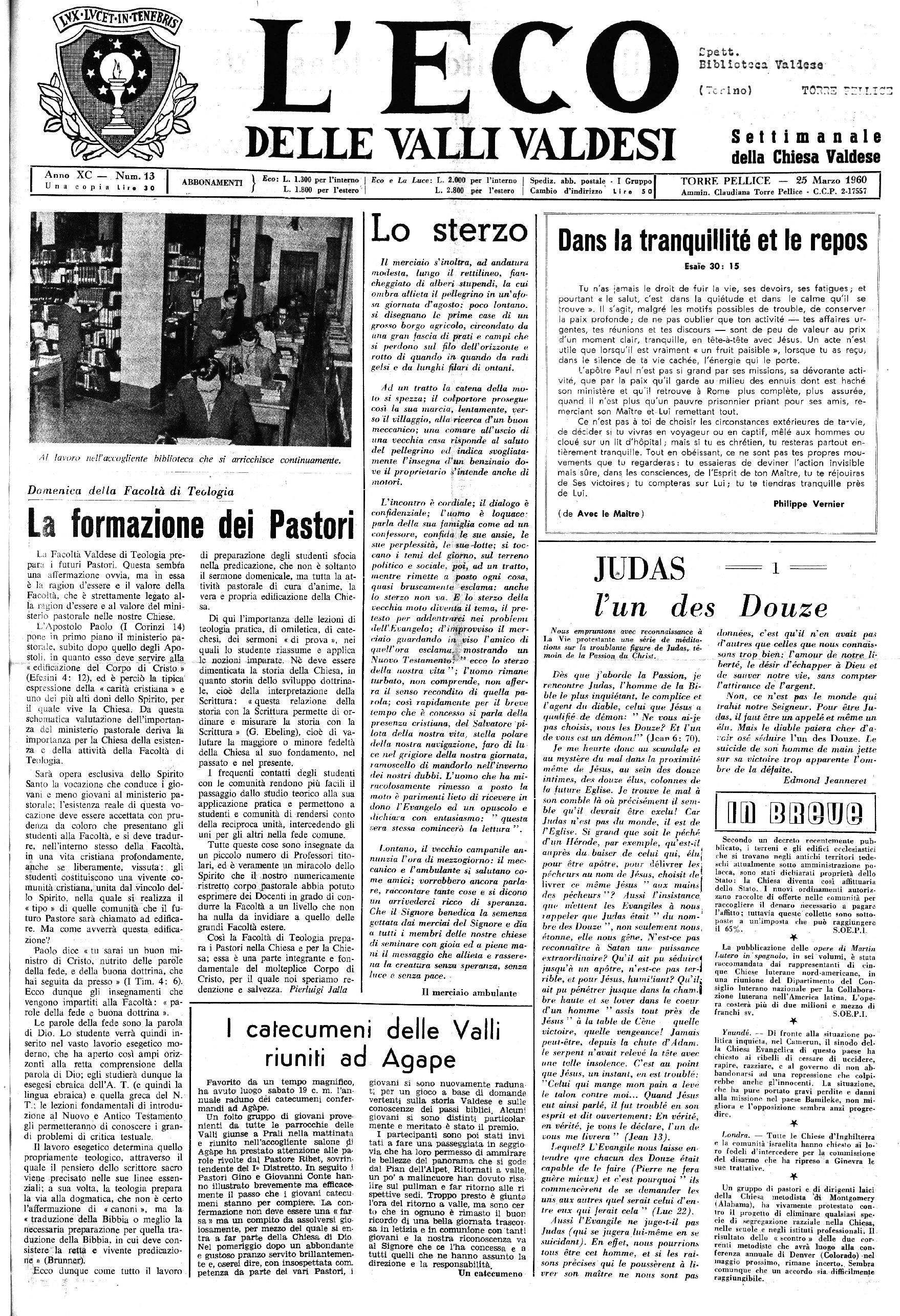 Anno Una XC — Num. 13 I ABBONAMEN'n 1 Eco: L. 1.300 per l’interno Eco e La Luce: L. 2.000 per l’interno Spediz. abb. postale - I Gruppo I TORRE PELLICE - 25 Marzo 1960