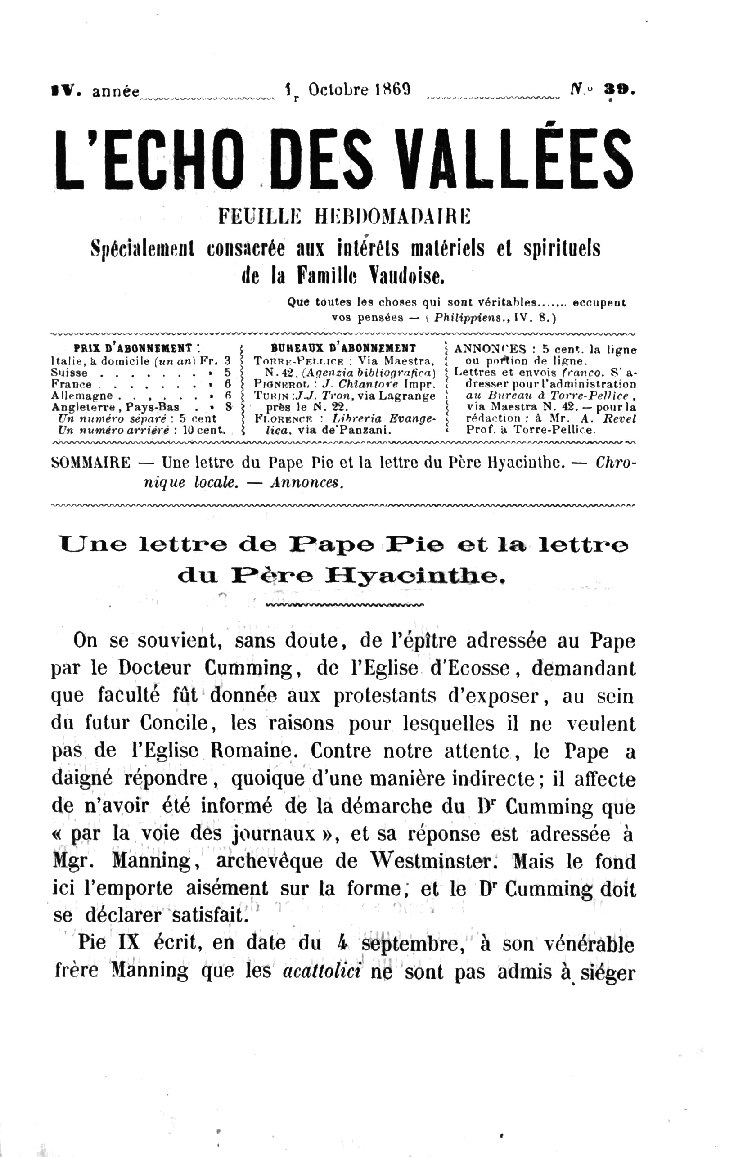 SOMMAIRE — Une lettre du Pape Pie et la lettre du Père Hyacinthe. — Chronique locale. — Annonces.