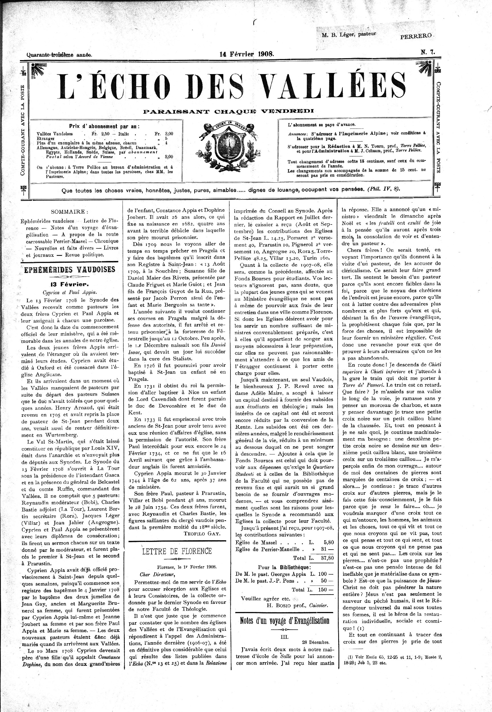 et pour l’Administration A M. J. Coïsson, prof., Torre Pellice.