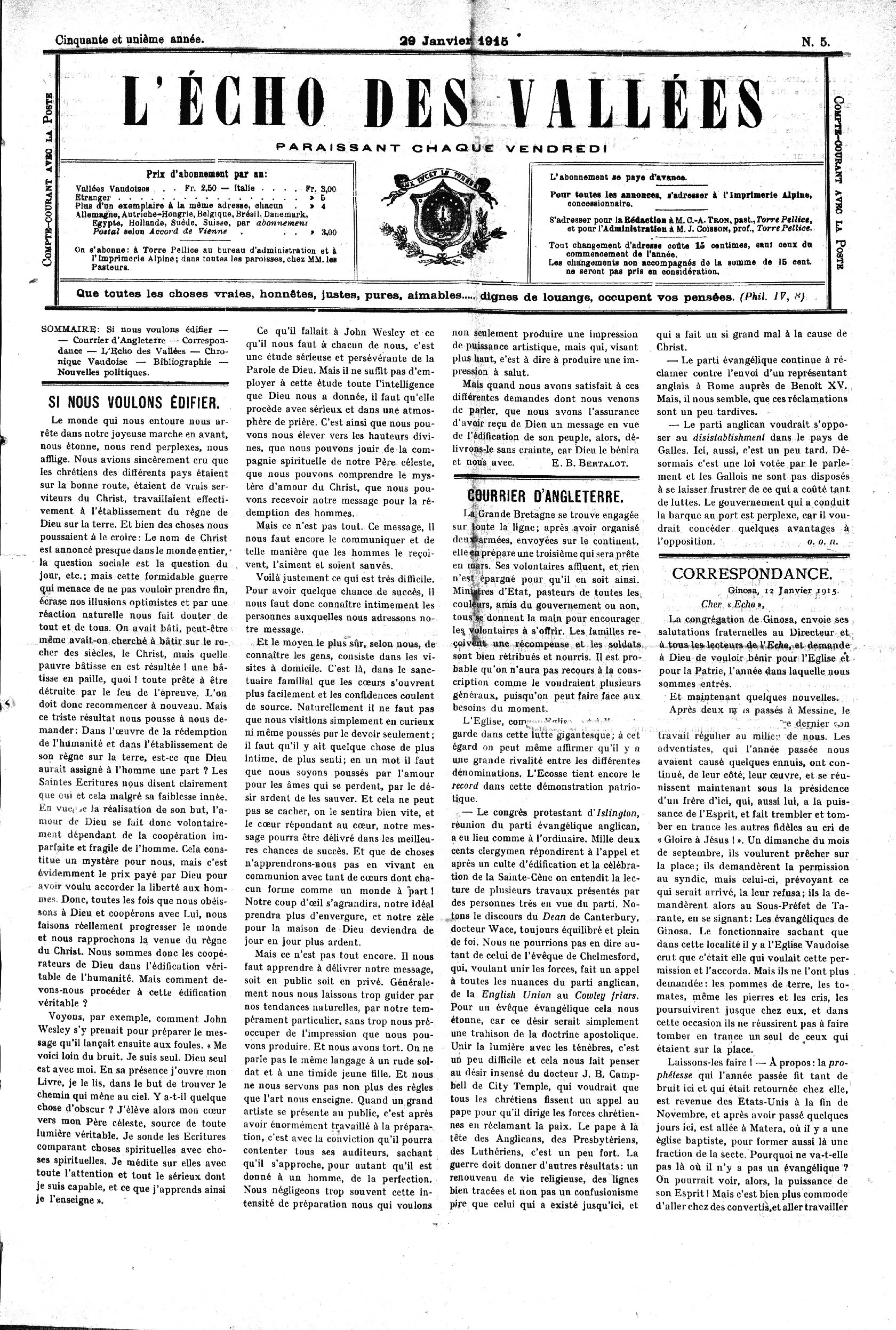 — Courrier d’Angleterre — Correspondance — L’Echo des Vallées — Chronique Vaudoise — Bibliographie —