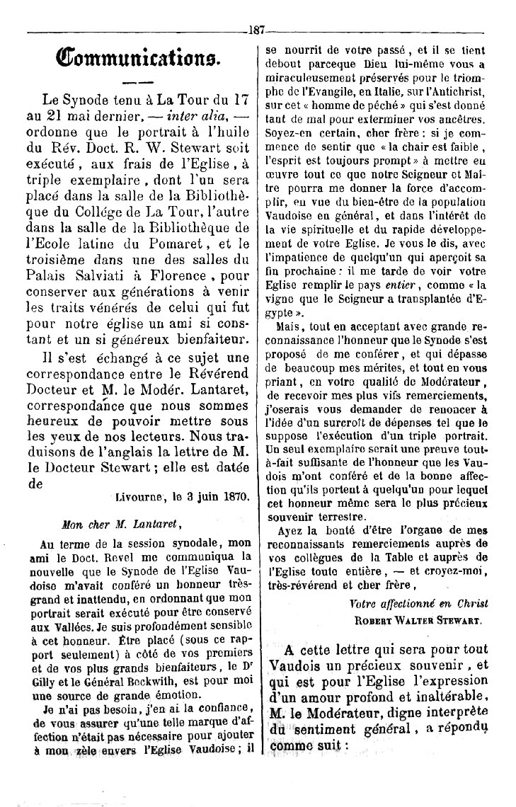des propositions, dout faisait partie M. Albert Revel, proposa tout à coup, au Synode , dans un moment où je ne me trouvais pas dans l’Assemblée, la nomination