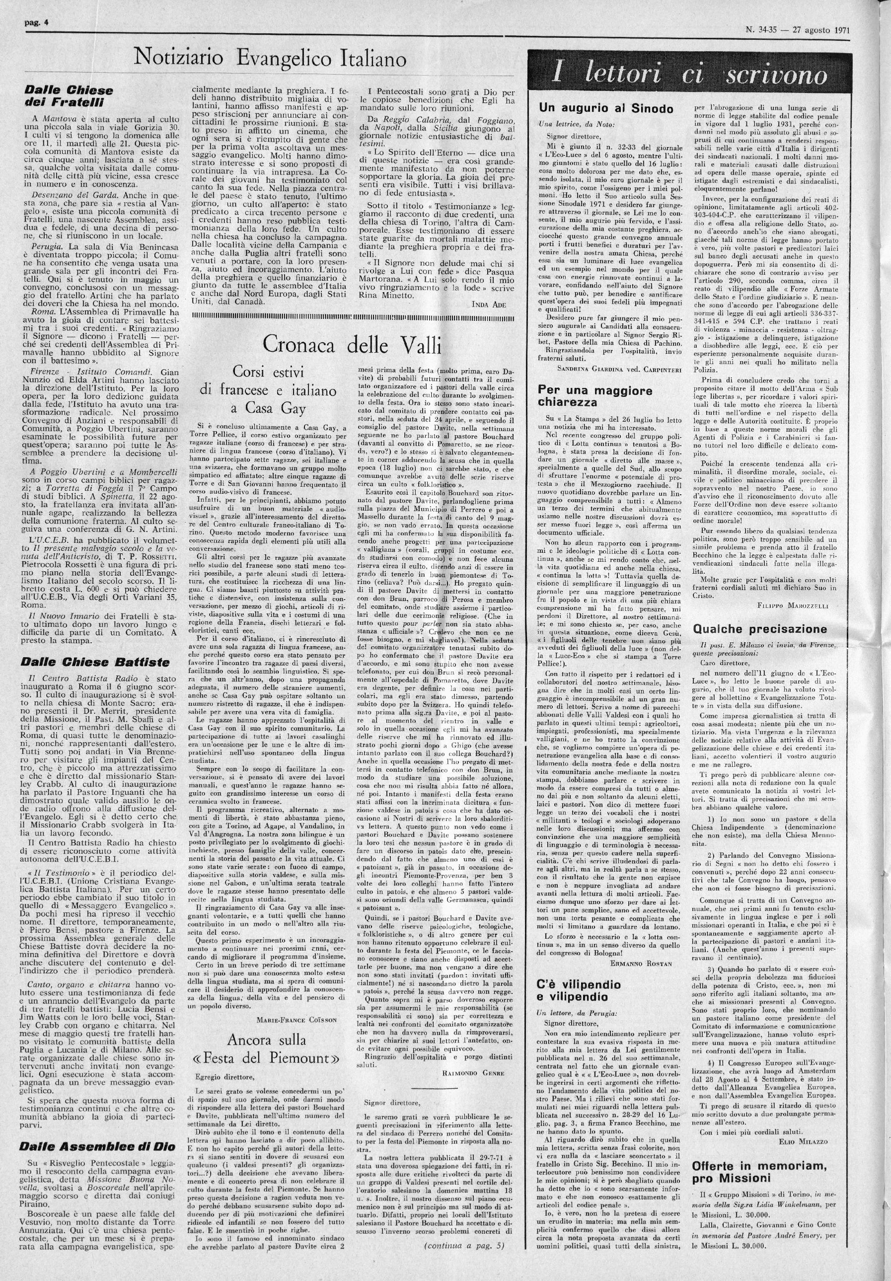 Anno 108 - Nam. 34-35 Una copia Lire 80 ABBQNAMENTI { 3 P" l’eterno 1 L. 4.000 per resterò Sped. in abb. postale - I Gruppo bis/70 1 TORRE PELLICE — 27 Agosto 1971 Cambio di indirizzo Lire 100 | Amm.: Afia Cavour 1 - 10066 Torre Pellice - c.c.p. 2/33094