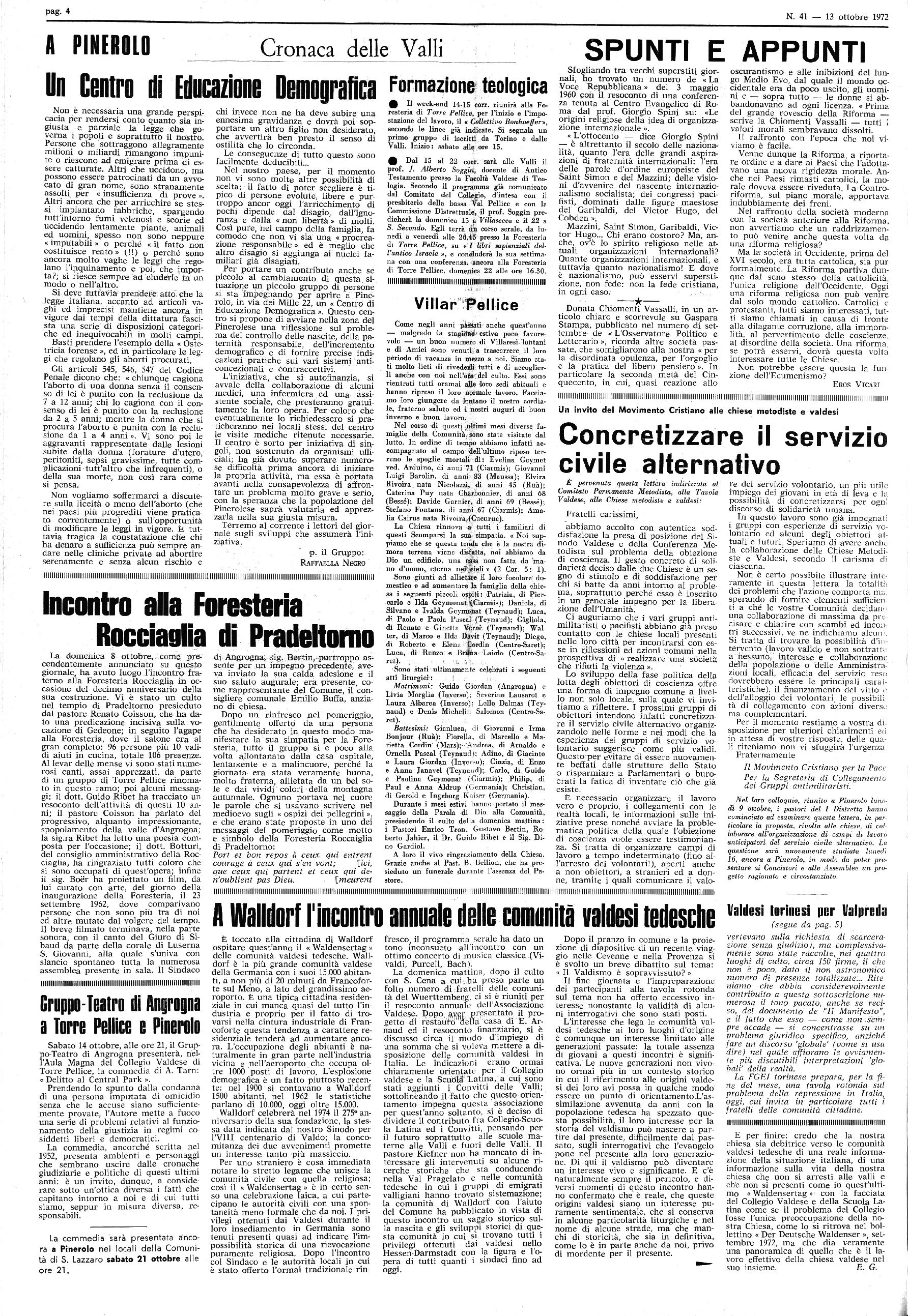 Anno 109 - Num. 41 ABBONAMENTI ( L. 3.500 per l’interno Sped. in abb. postale - I Gruppo bis/70 1 TORRE PELLICE - 13 Ottobre 1972 I