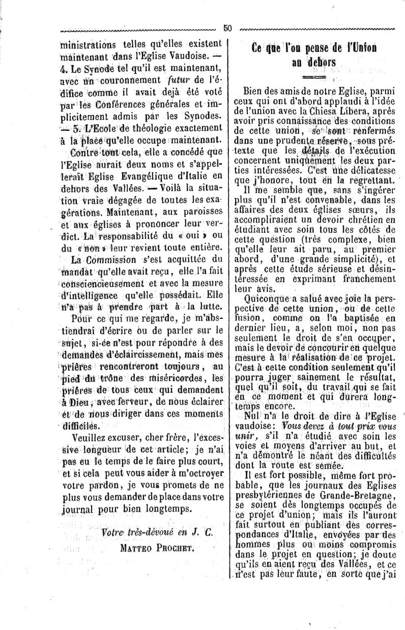 Vaudoise de Rome s’est déclarée favorable à l’Union avec l’Eglise Libre,