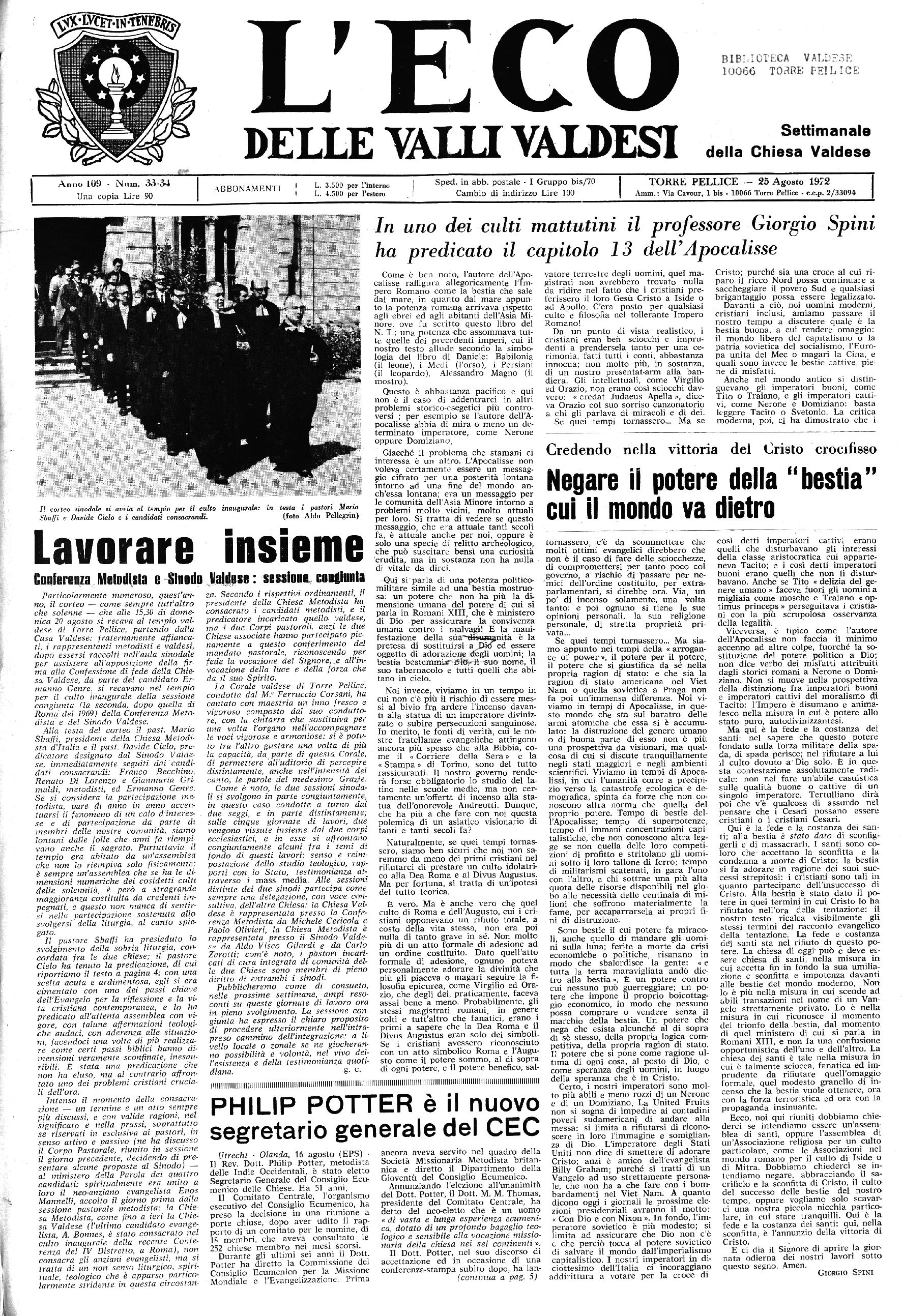Anno 109 - ¡\um. 33-34 Una copia Lire 90 ABBONAMENTI j L. 3.500 per rinterno L. 4.500 per Testerò Sped. in abb. postale - I Gruppo bis/70 Cambio di indirizzo Lire 100 TORKE PELLICE - 25 Agosto 1972 Amm. : Via Cavour, 1 bis • 10066 Torre Pellice - c.c.p. 2/33094