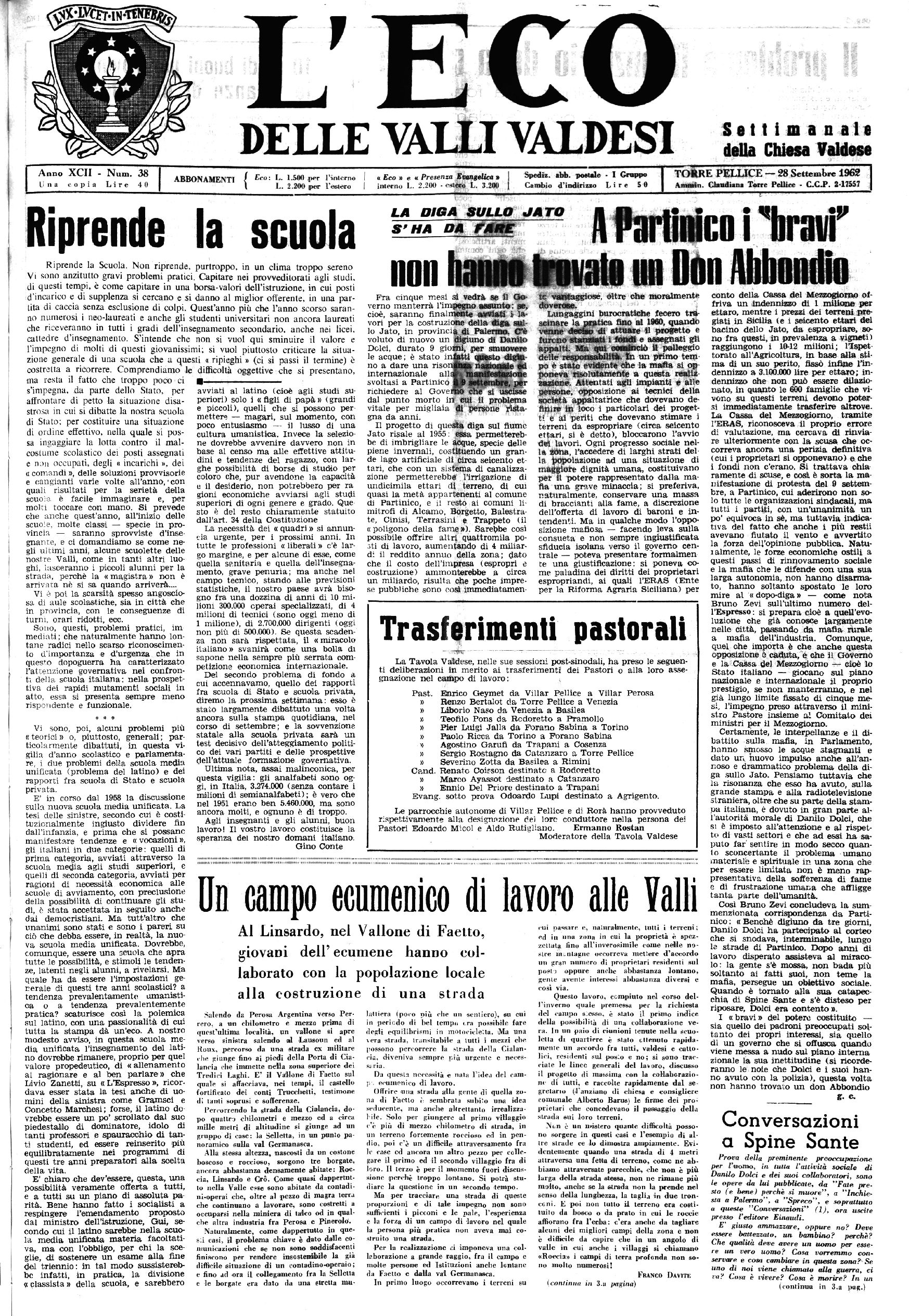 Anno XCII - Nudo. 38 ABBONA MENTI Í Eco: L. 1.500 per l’inlerno 1 « Eco » e « Presenza Evangelica > SpedÌR. afab. poaude - I Grappo 1 TCHIRE PELUCE —28 Settembre 1962
