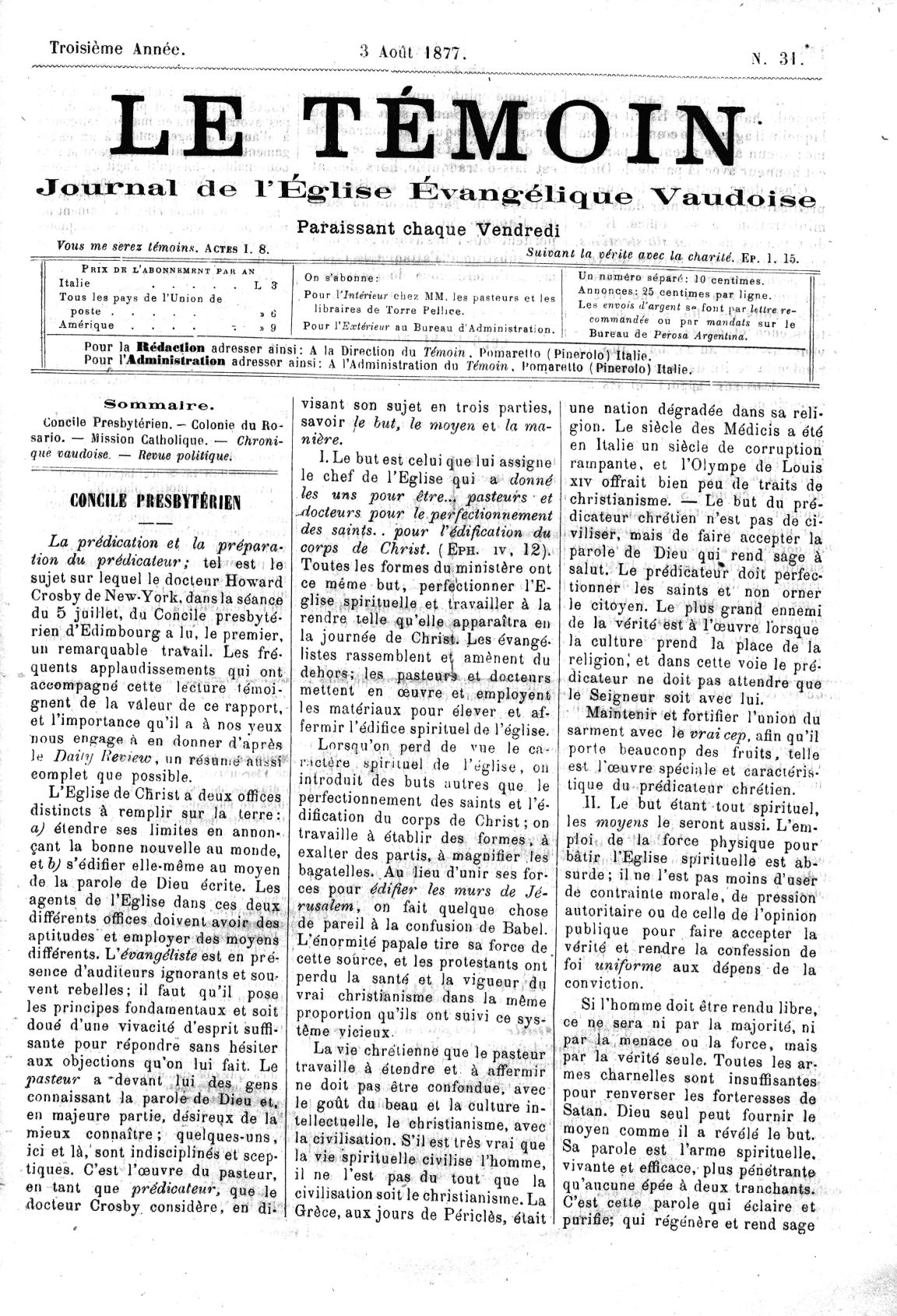 On s’abonne: ' Pour VIntérieur chez MM. les pasteurs et les libraires de Torre Pelljce. Pour i’Extérieiir au Bureau d’Administration. Un numéro séparé; JO centimes. Annonces,: 25 centimes par ligne. Les envoi's d'argent s^ font par htire re- commandée ou par mandats sur Je Bureau de Perosa Argentina,