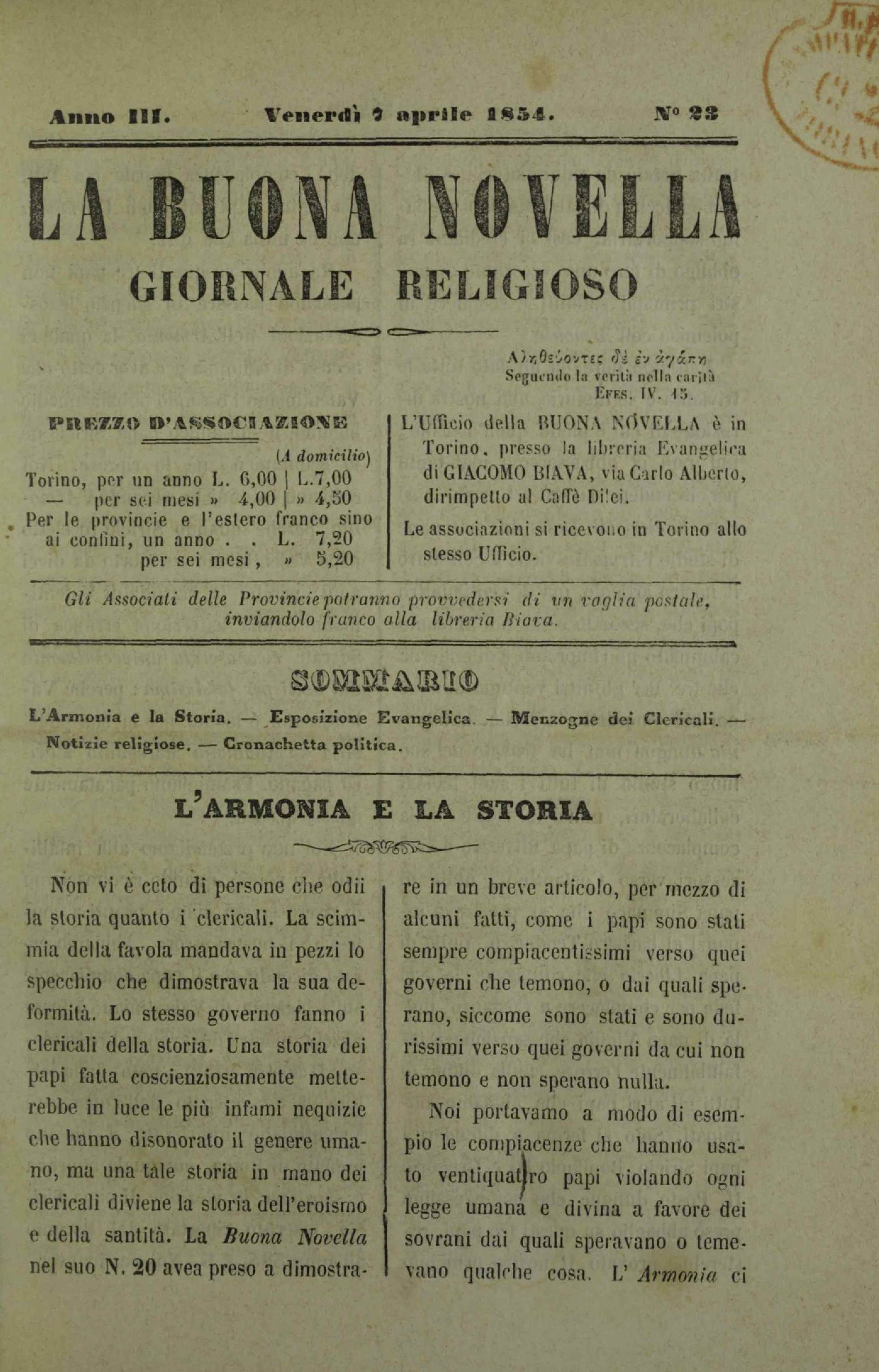 L’Armonia e la Storia. — Esposizione Evangelica. — Menzogne dei Clericali.