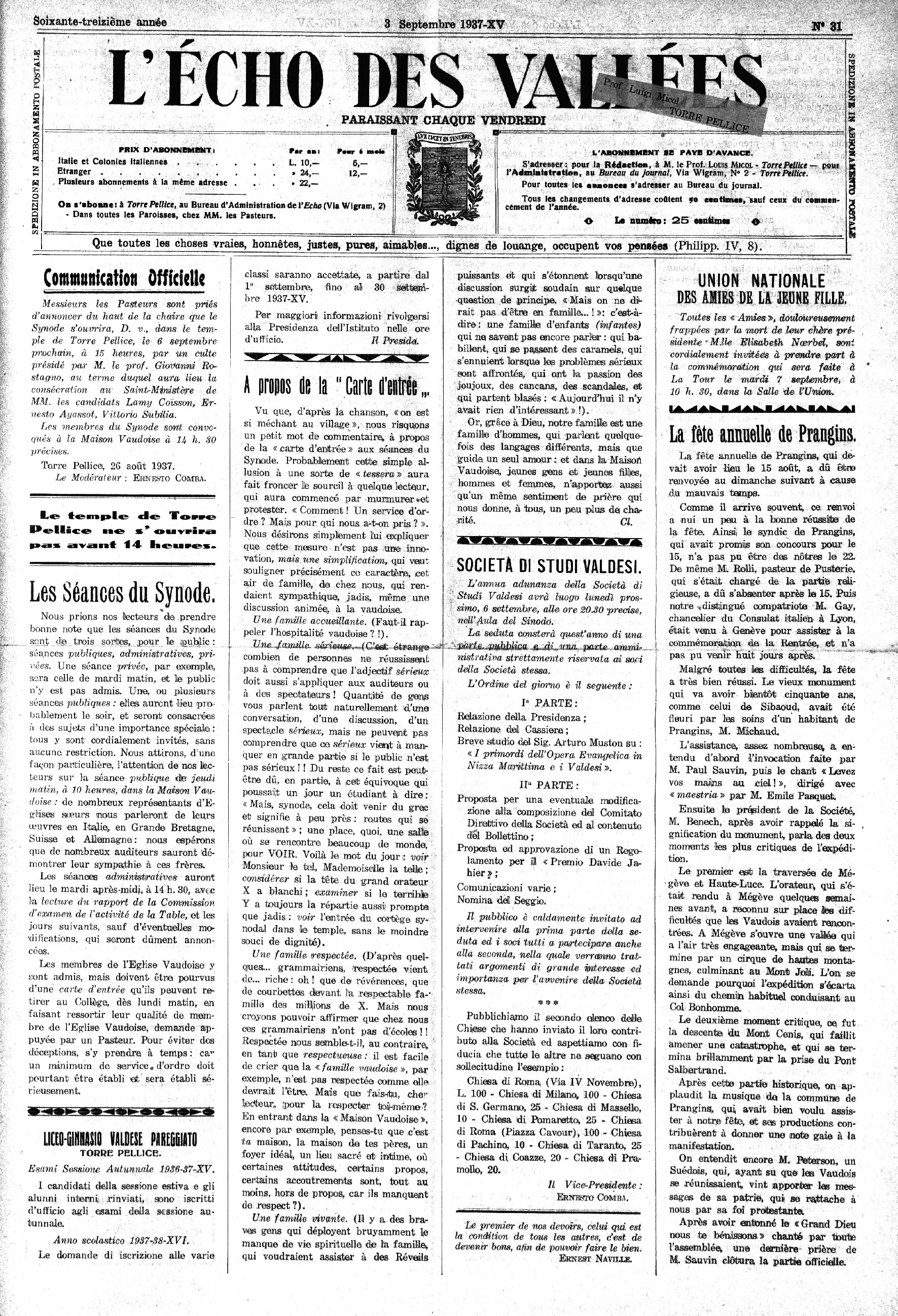 Synode s’ouvrira, D. v., dans le temple de Torre Pellice, le 6 septembre