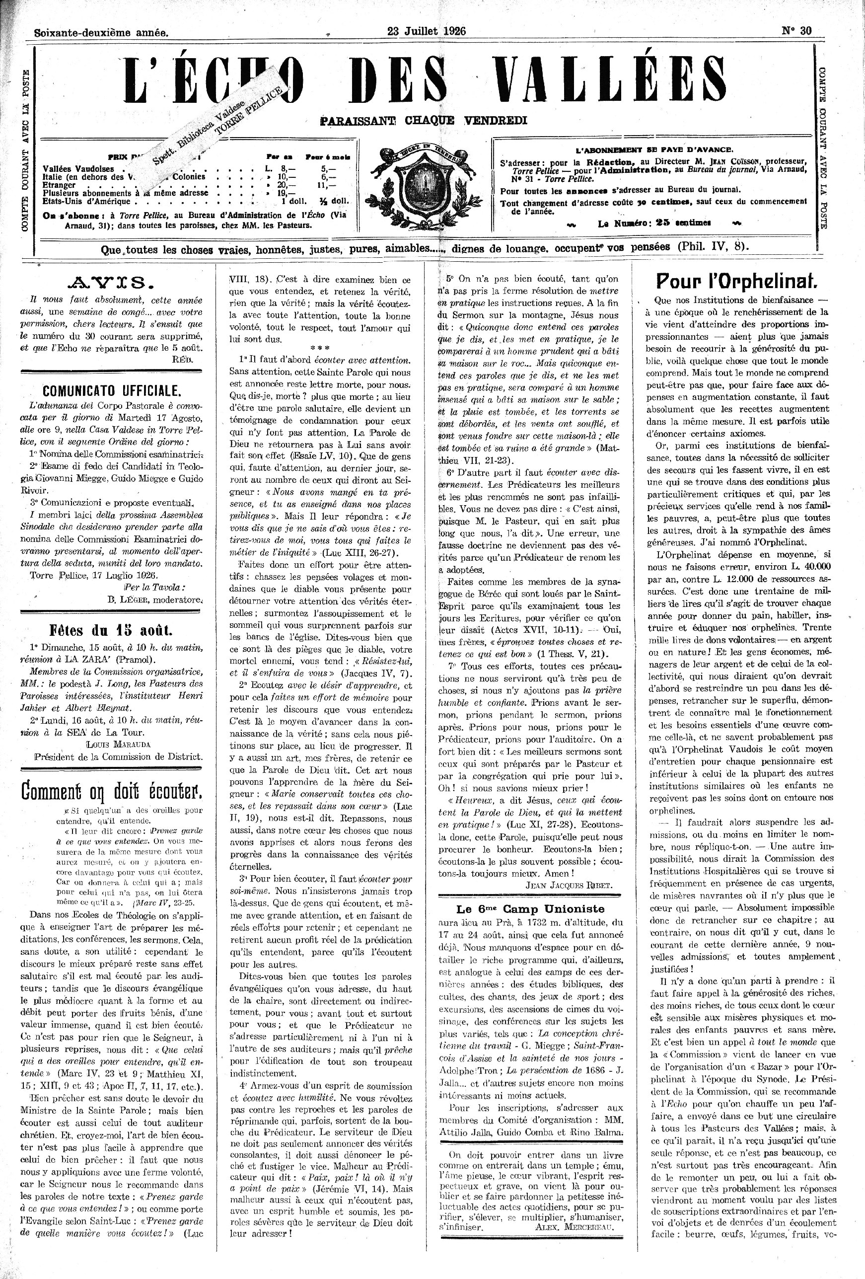 On «'abonne i à Torre Pellice, au Bureau d’Administration de VÉcho (Via