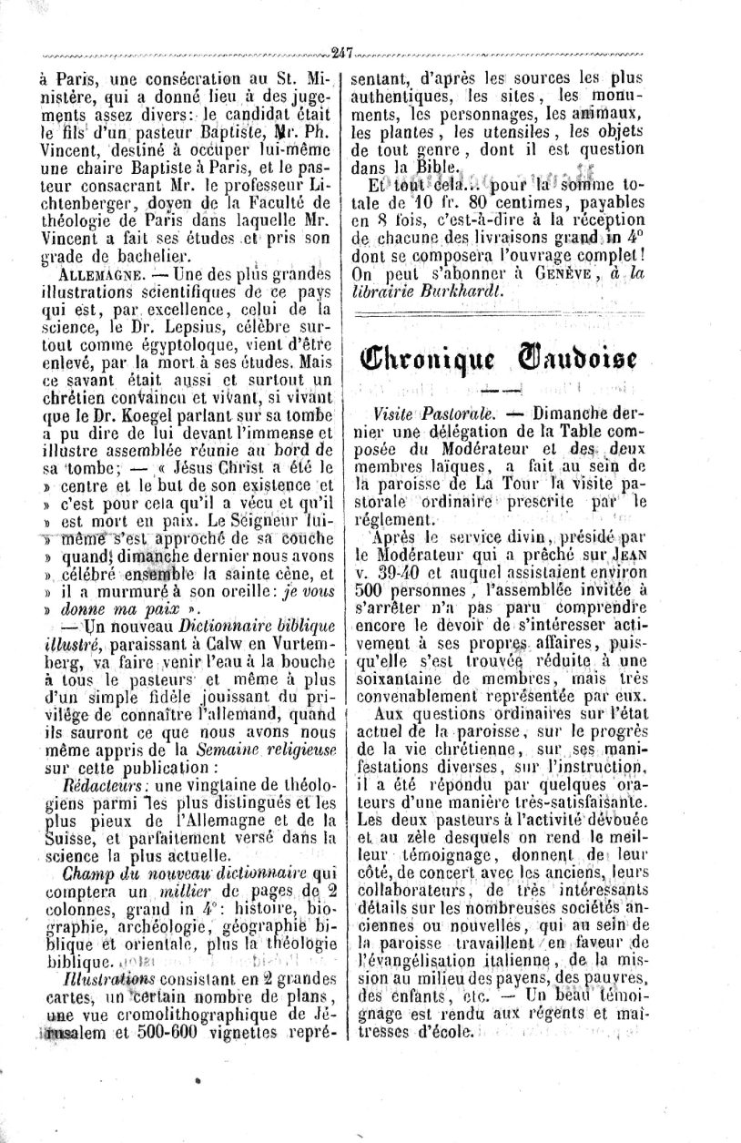 Visite Pastorale. — Dimanche dernier une délégation de la Table composée du Modérateur et des deux