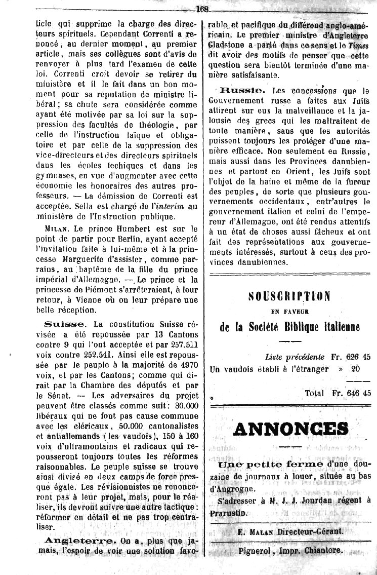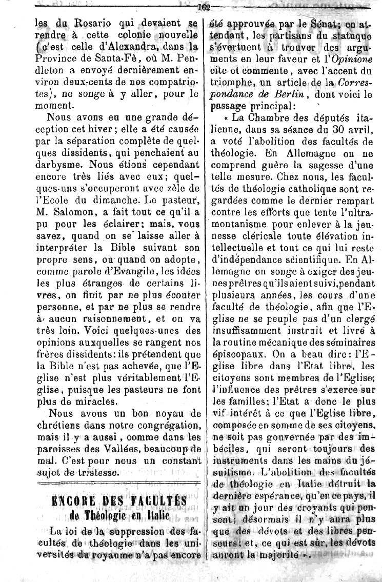 facultés de théologie en Italie. — Correspondance. — Nouvelles religieuses. — Fariélés. — Chronique vaudoise. — Chronique politique. — Souscription Société Biblique Italienne.