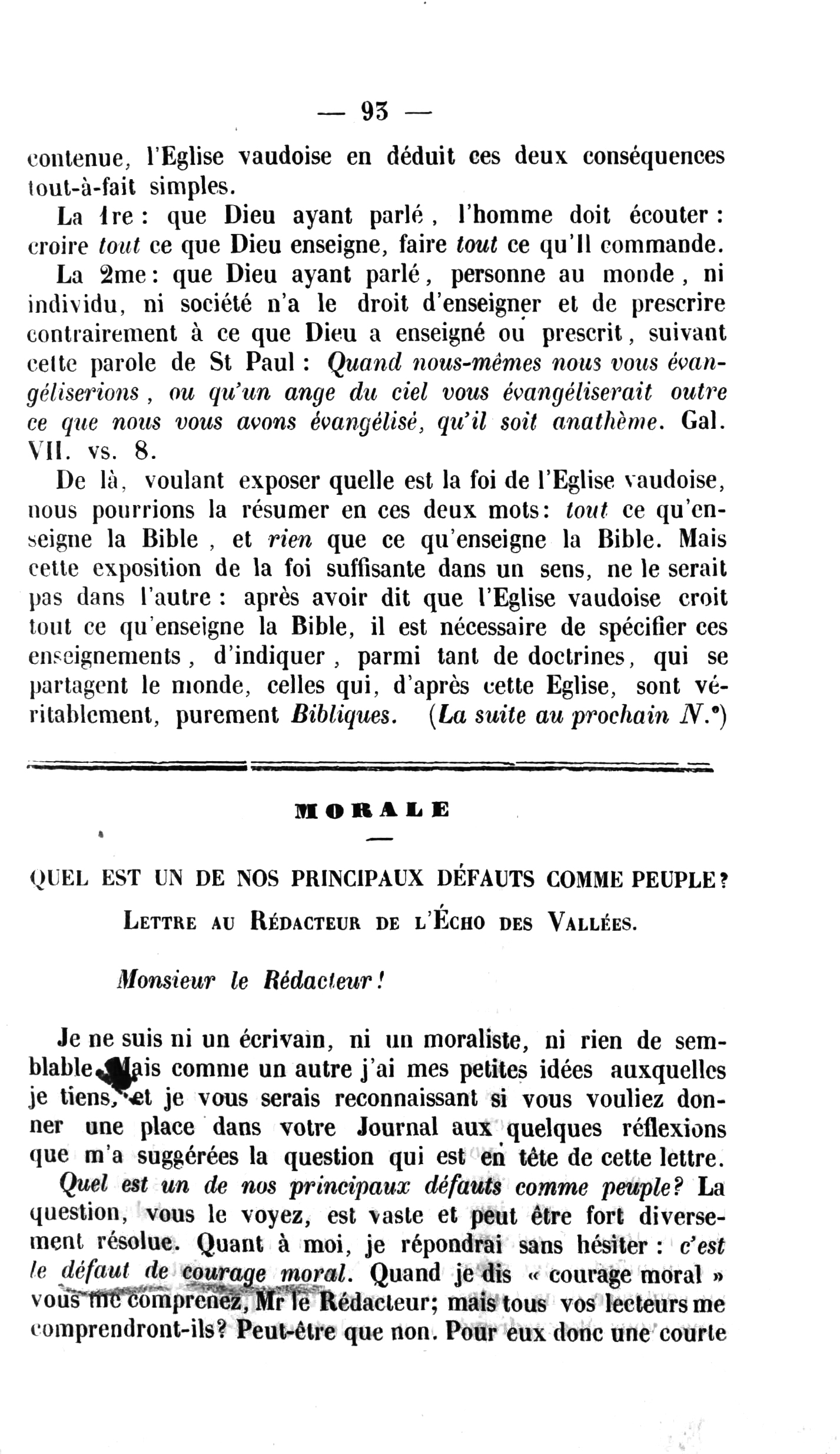 ---- Eijlise: l’Eglise Vaudoise. — Morale: quel est un de nos prin