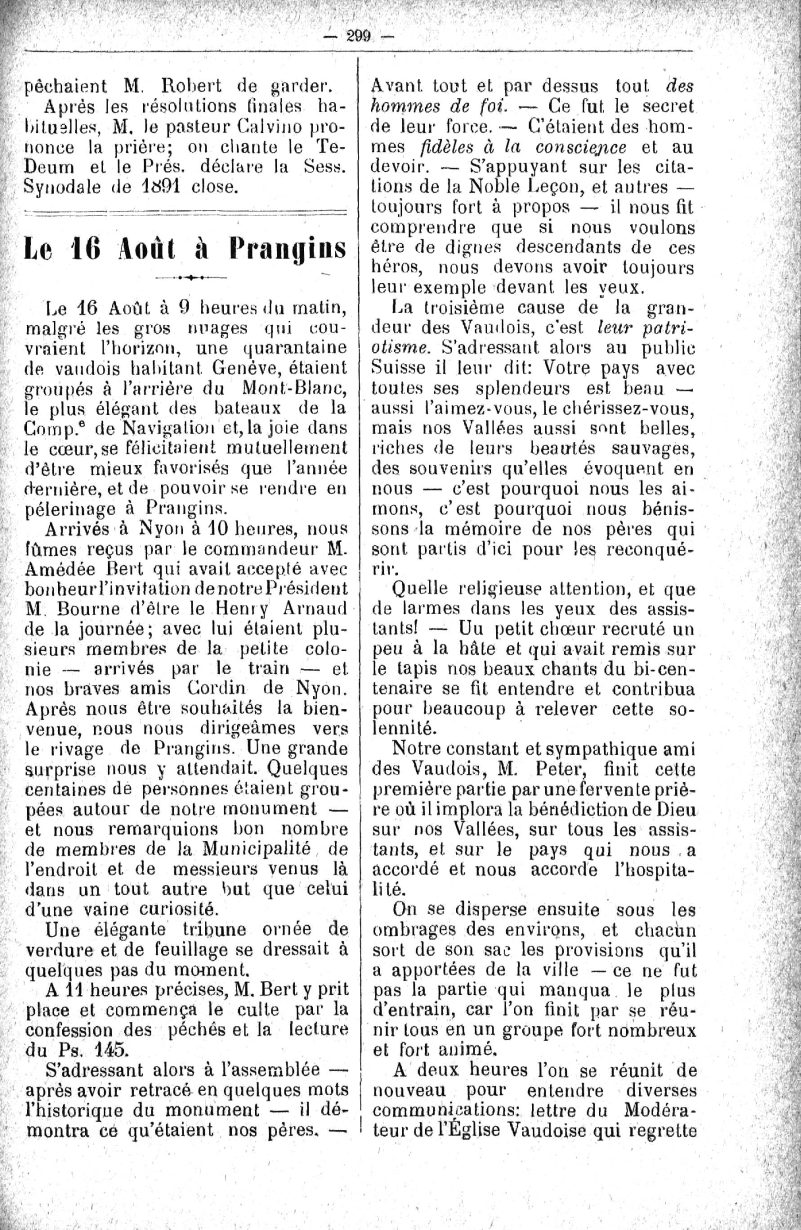 Le Synode de 1891 — Le 16 Août à Prangins — Correspondance — Les horreurs