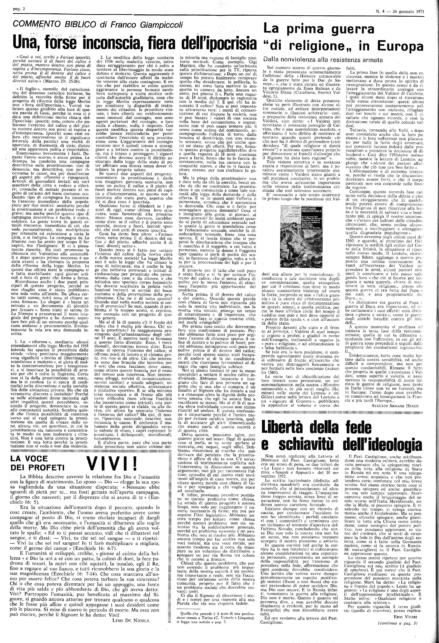 Anno 110 - Num. 4 ABBONAMENTI | L. 3.500 per l’interno Sped. in abb. postale - I Gruppo bis/70 1 TORRE PELLICE 26 Gennaio 1973