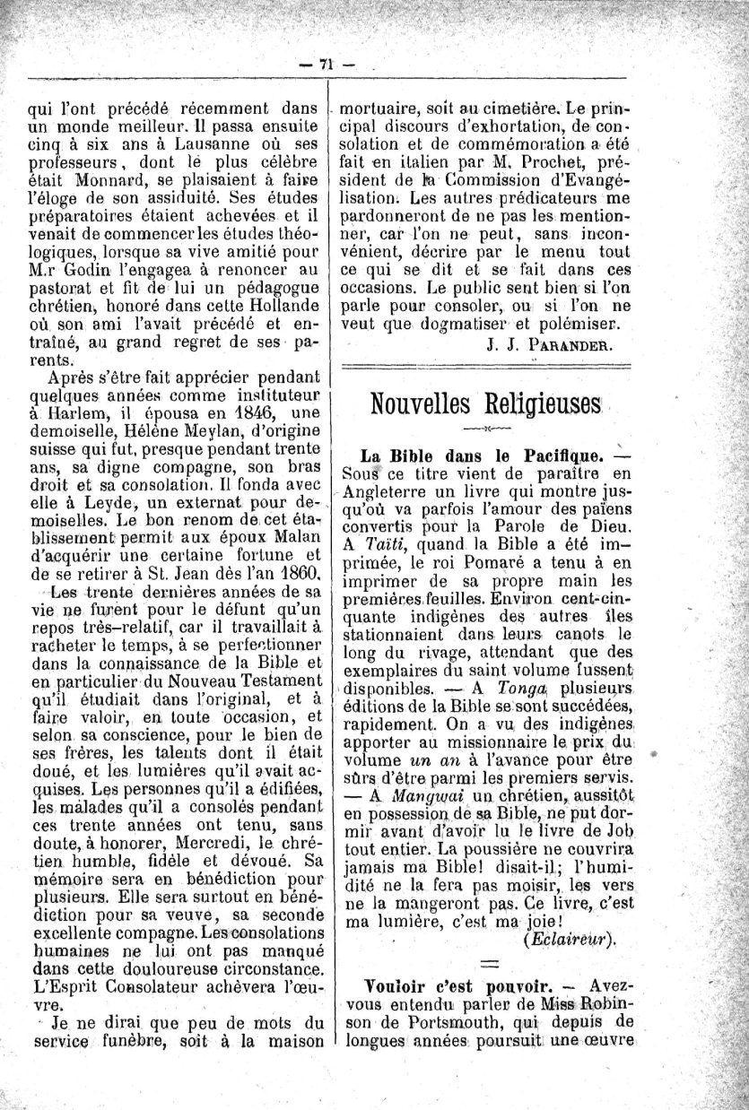— Nécrologie: M. A. B. Malan. — Nouvelles religieuse.s. — Revue politique.