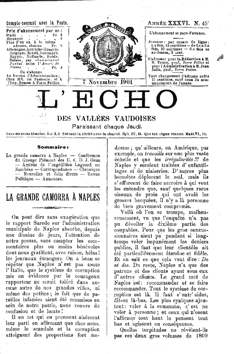 Prix d’abonnement par an : Italie . . . . Fr. 3 EbvaDger ... „ 6 Plus d’un ex. à la même adresse, chacun Fr. 5 Allemagne, Autriche-Hongrie. Belgique, Brésil,Danemark, Egypte, Hollande, Suède, Suisae, par ahontigmeni Posteti selon V Âceurd de Vienns . . , Fr. 3 On s’abonne Au bureau d’Âdmini.stration ; Chez MM, les Pasteurs; et à rimp. Besson à Torre Pellice. [l'abonnement se paye d’avanoe. Annonces; pal' espaoc de lignes l.e fois, 15 centimes — de 2,e à 5.e : fois, 10 centimes — 6.e fois ee au-dessus,, 6 cent. S’adresser pour la Rédaction i H. N. Tourn, prof., Torre PelUee et pour l'Administration à M. Jean Jalla, prof,, 2’orre PelUee. Tout changement d’adresse coûte 15 centimes, sauf ceux du com- mencement de rannêe.