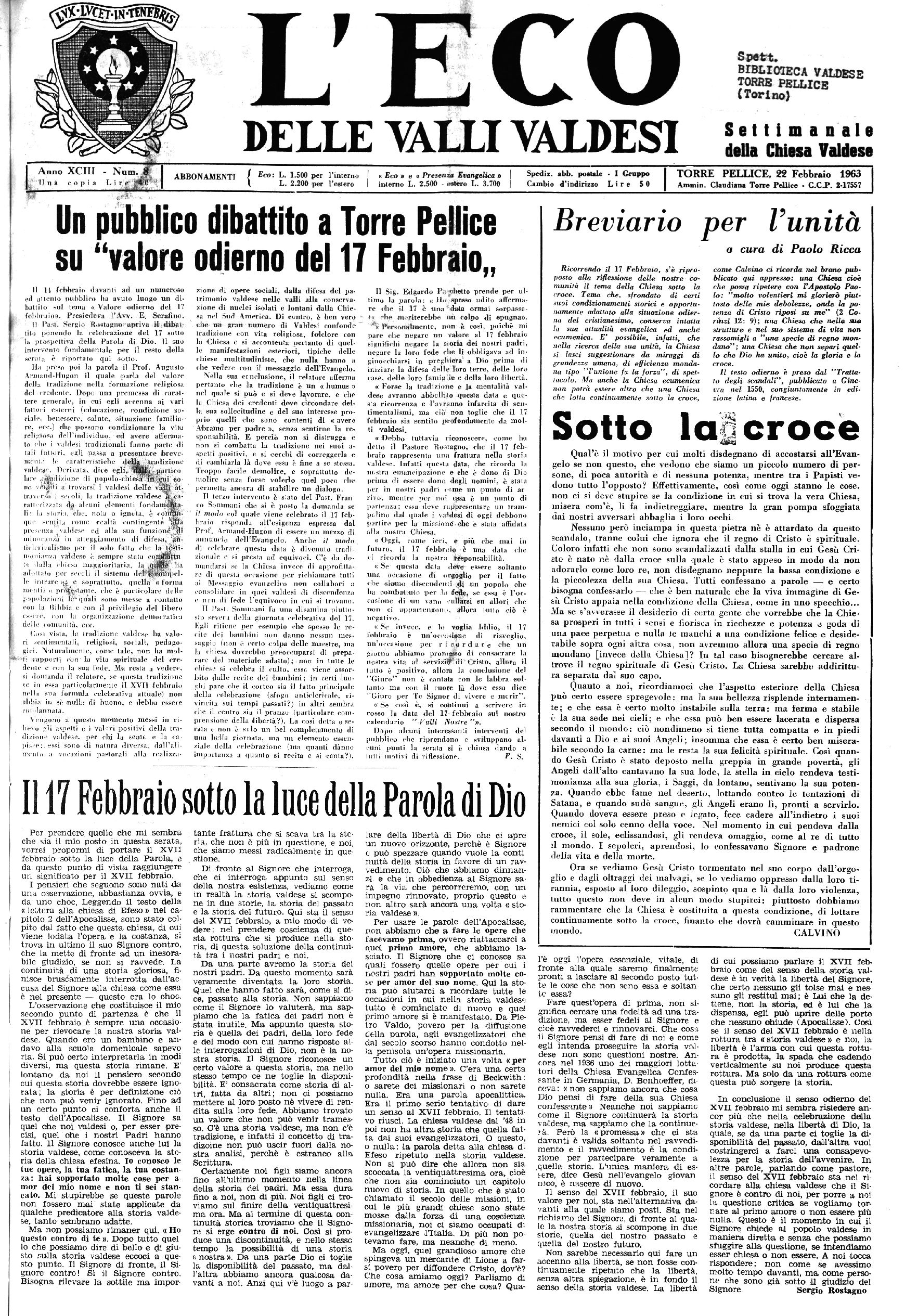 Anno xeni - Num. di' 1 Lire- 8 f > ' ABBONAMENTI / Eco: L. 1.500 per Tinlerno « Eco B e « Presenza Evangelica » | Spediz. abb. postale - I Gruppo 1 TORRE PELLICE. 22 Febbraio 1963