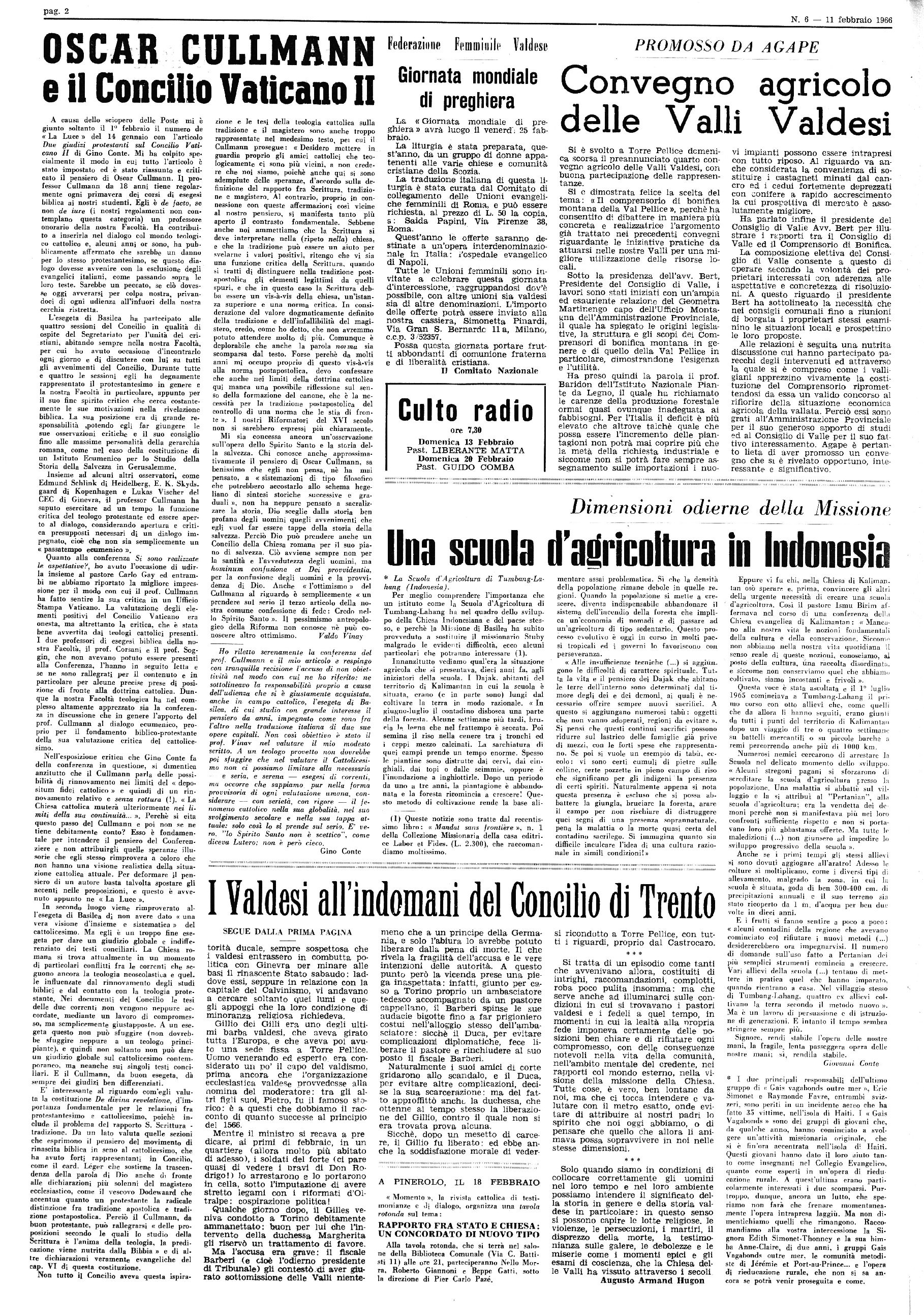 1 Anno XCVI - Num. 6 I Eco: L. 2.000 per l’interno Spedizione in abbonamento postai« - I Gruppo bis TORRE PELLICE - 11 Febbraio 1966