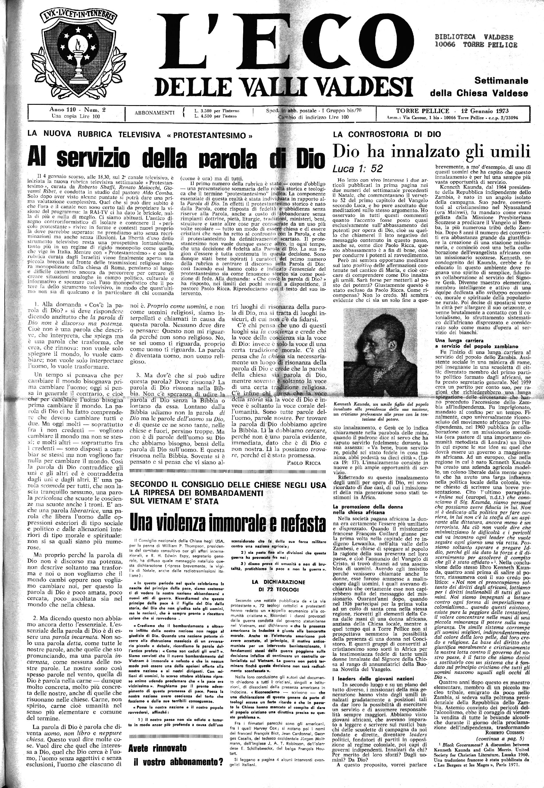 Una copia Lire 100 L. 4.500 per l’estero Cambio di indirizzo Lire 100 1 Amm. : Via Cavour, 1 bis - 10066 Torre Pellice - c.c.p. 2/33094