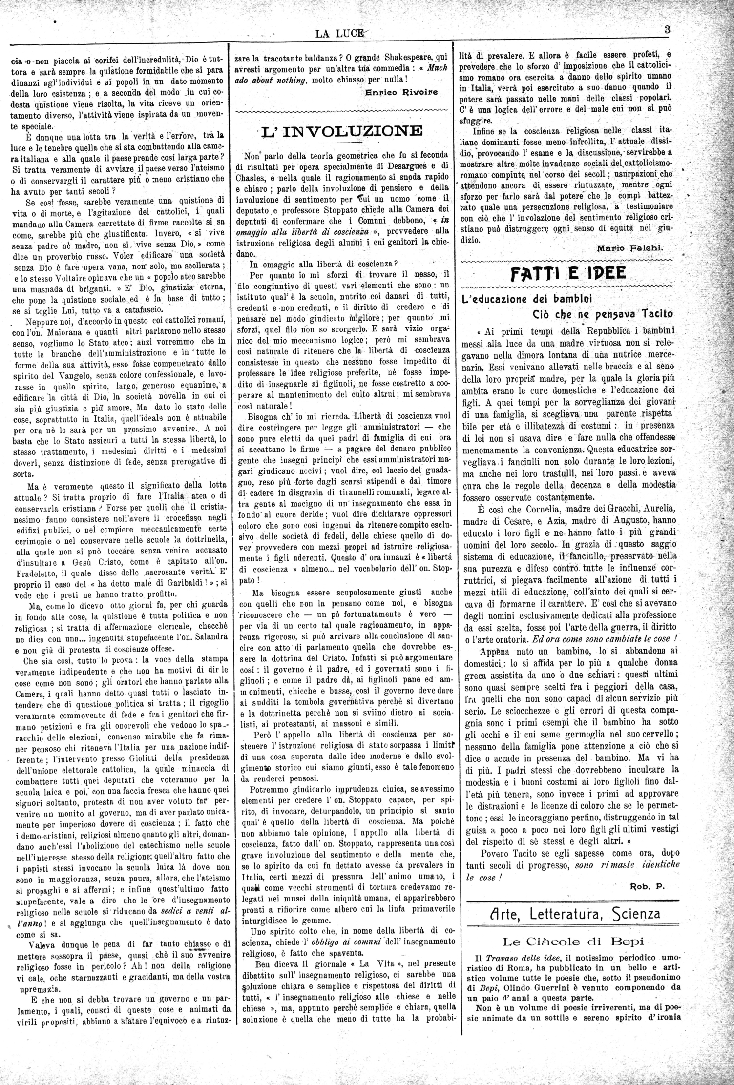di V. Gareetto — Cronaca del movimento religioso — Lord Overtonn, di A. Musxon — Mentre si discute, di E. Rivoire. — Involuzione, di M.