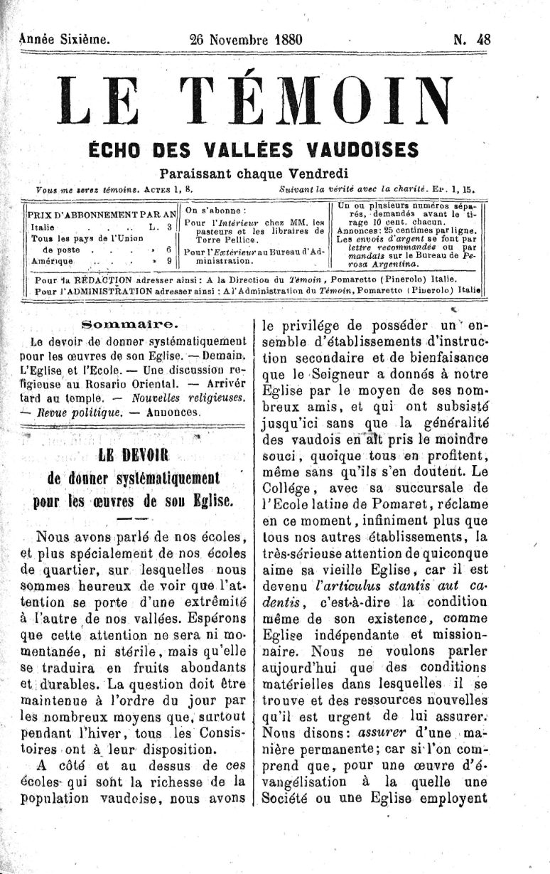 Pour ’la RÉDACTION adresser ainsi: A la Birectioo du Témoin, Pomaretto (Pinerolo) Italie. Pour J’ADMINÎSTRATION adresser ainsi : Al' Administralinn du Témoin, Pomaretto ( Pinerolo) Italie