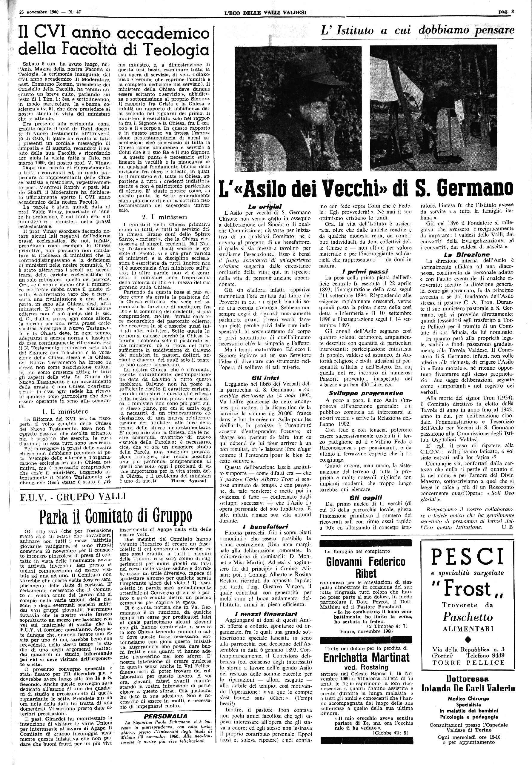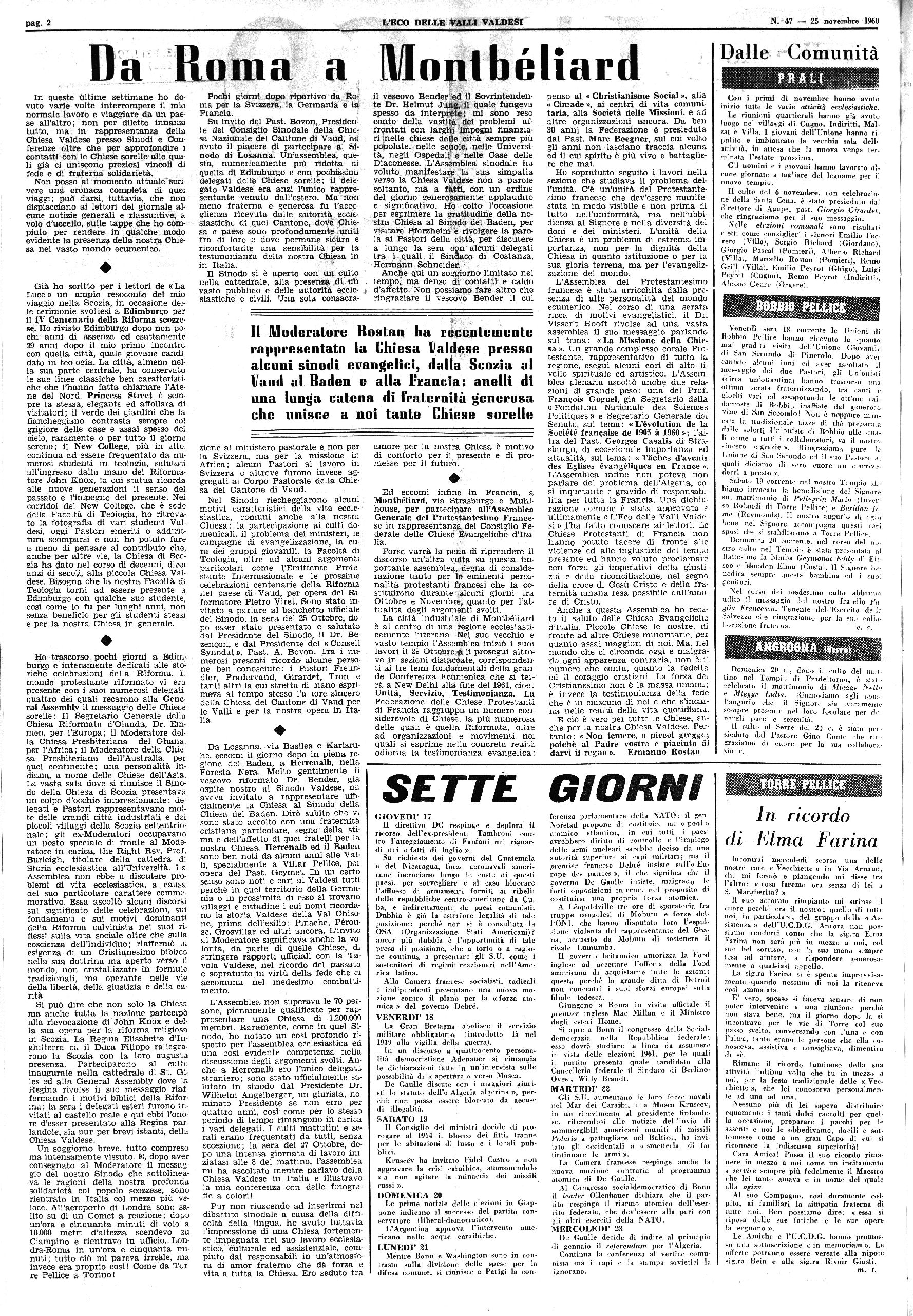 Anno XC — Num. 47 Una copia Lira 30 ABBONAMENTI \ | ® 5. / L. 1.800 per Testerò I L. 2.1 KlO per Tinterno 00 per l’estero Spediz. abb. postale • I Groppo I TORRE PELLICE, 25 Novembre 1960 I Cambio d’indirizzo lira 5 0 I Ammin. Clandianà Torre Pellice - C.C.P. 2-17557 |