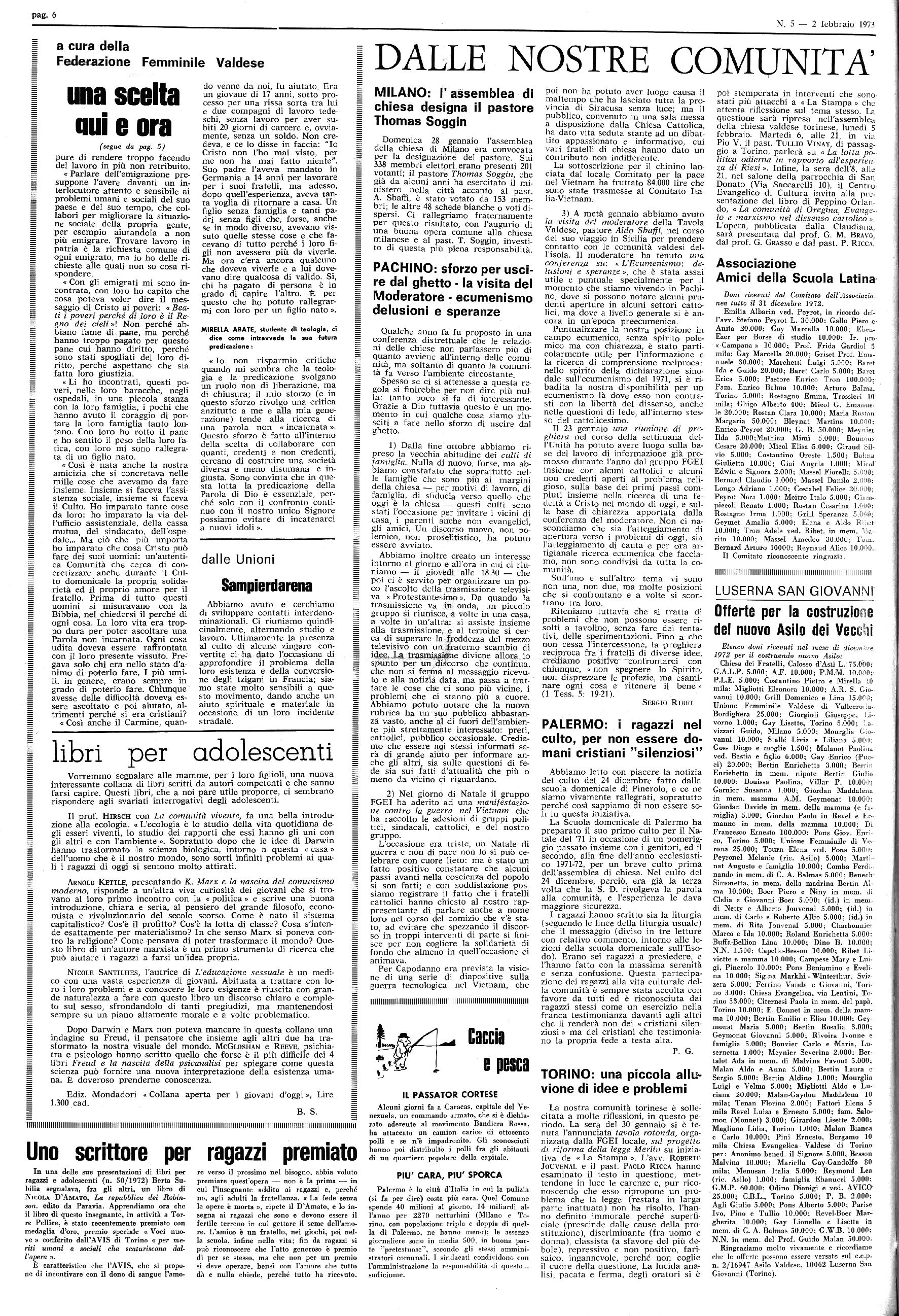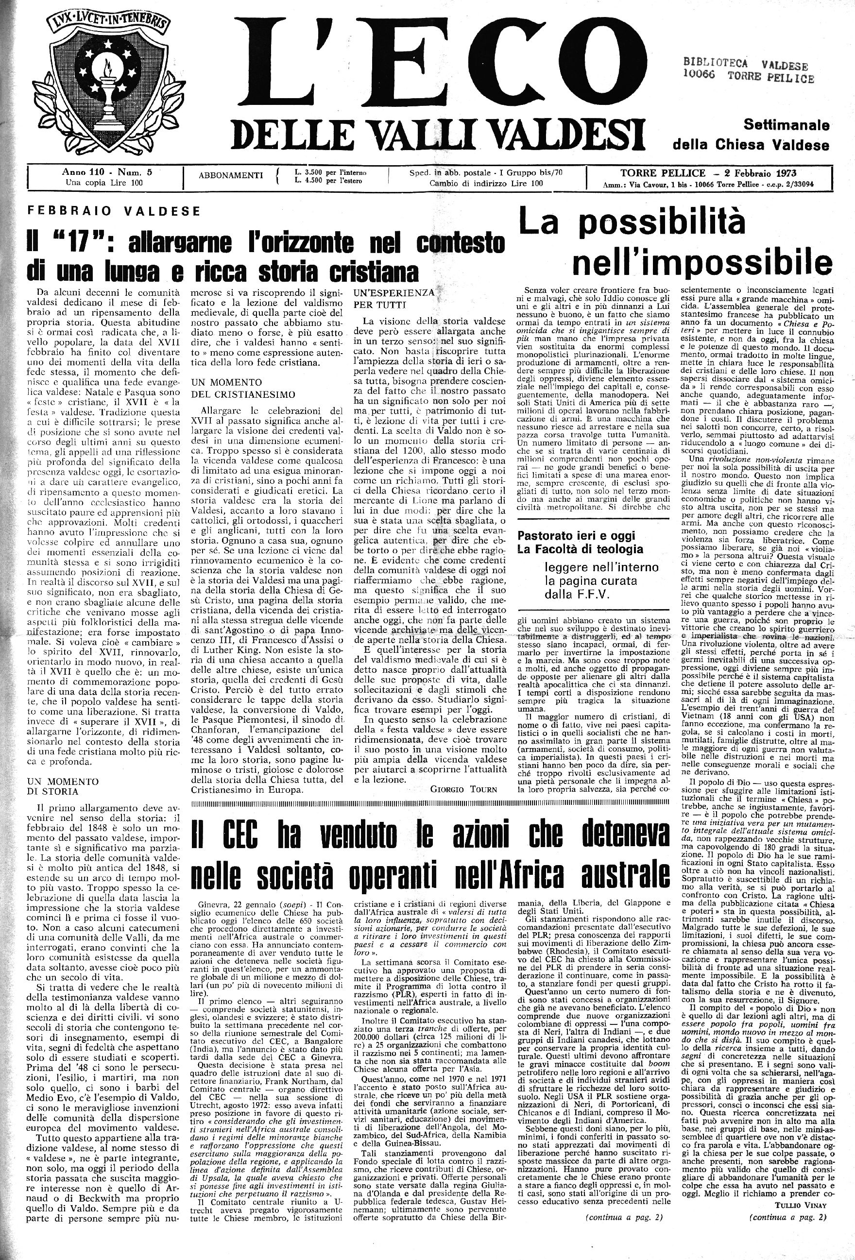 Anno 110 - Nam. 5 ABBONAMENTI | L. 3.500 per l’interno Sped. in abb. postale - I Gruppo bis/70 1 TORRE PELLICE - 2 Febbraio 1973