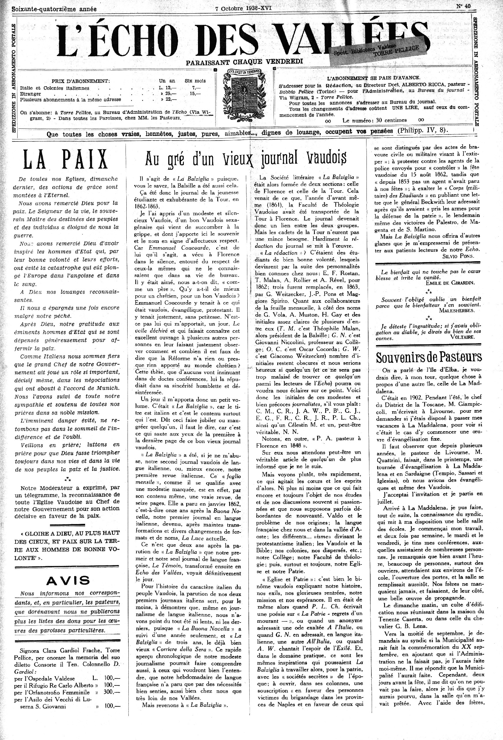 S’adresser pour la Rédaction, au Directeur Doct. ALBERTO RICCA, pasteur Bobbio Pellice (Torino) — pour rAdminlstration, au Bureau du journal Via Wigram, 2 - Torre Pellice.