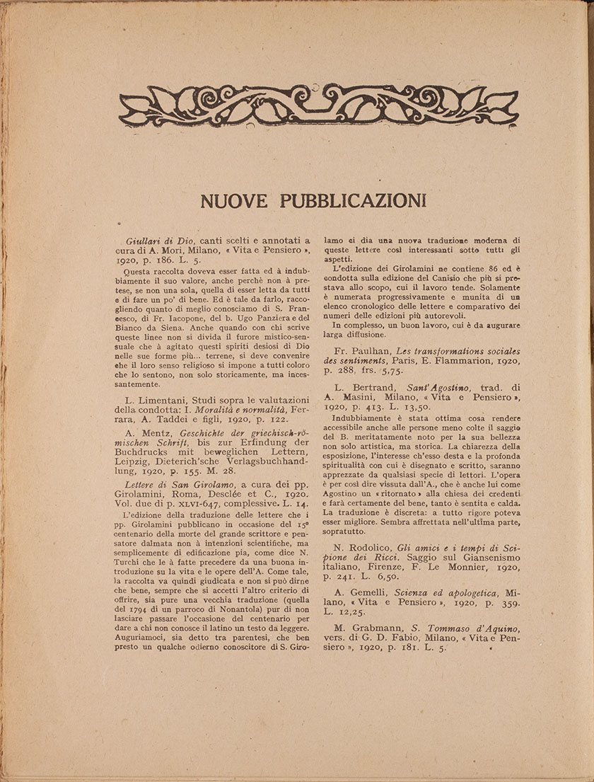 Storia delle Religioni: Storia e psicologia religiosa, p. 62; Religioni del mondo classico, p. 70; S. Girolamo, p. 71; Un nuovo manuale di storia dèi cristianesimo, p. 65.