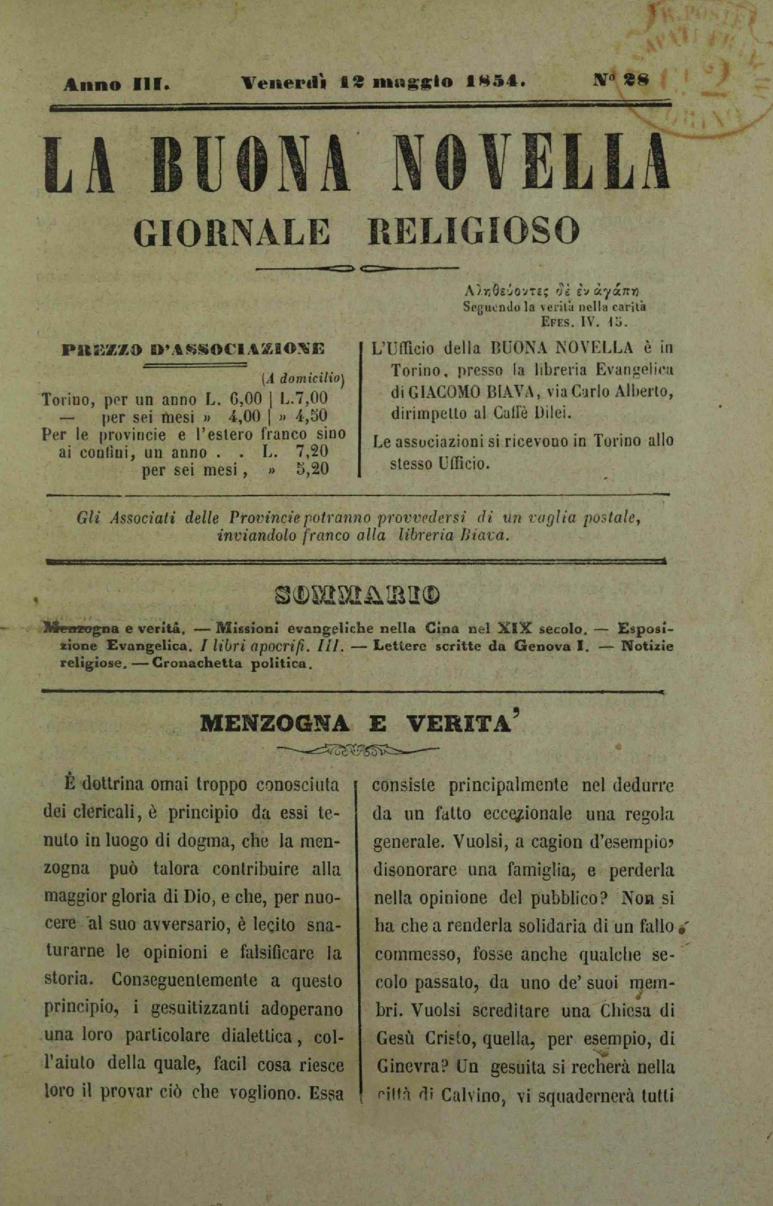 Mmogna e verità. — IUÌE<ion! evangeliche nella Cina nel XIX secolo. — Espoiicione Evangelica. I libri apocrifi. Ili. — Lettere «critte da Genova I. — Notizie