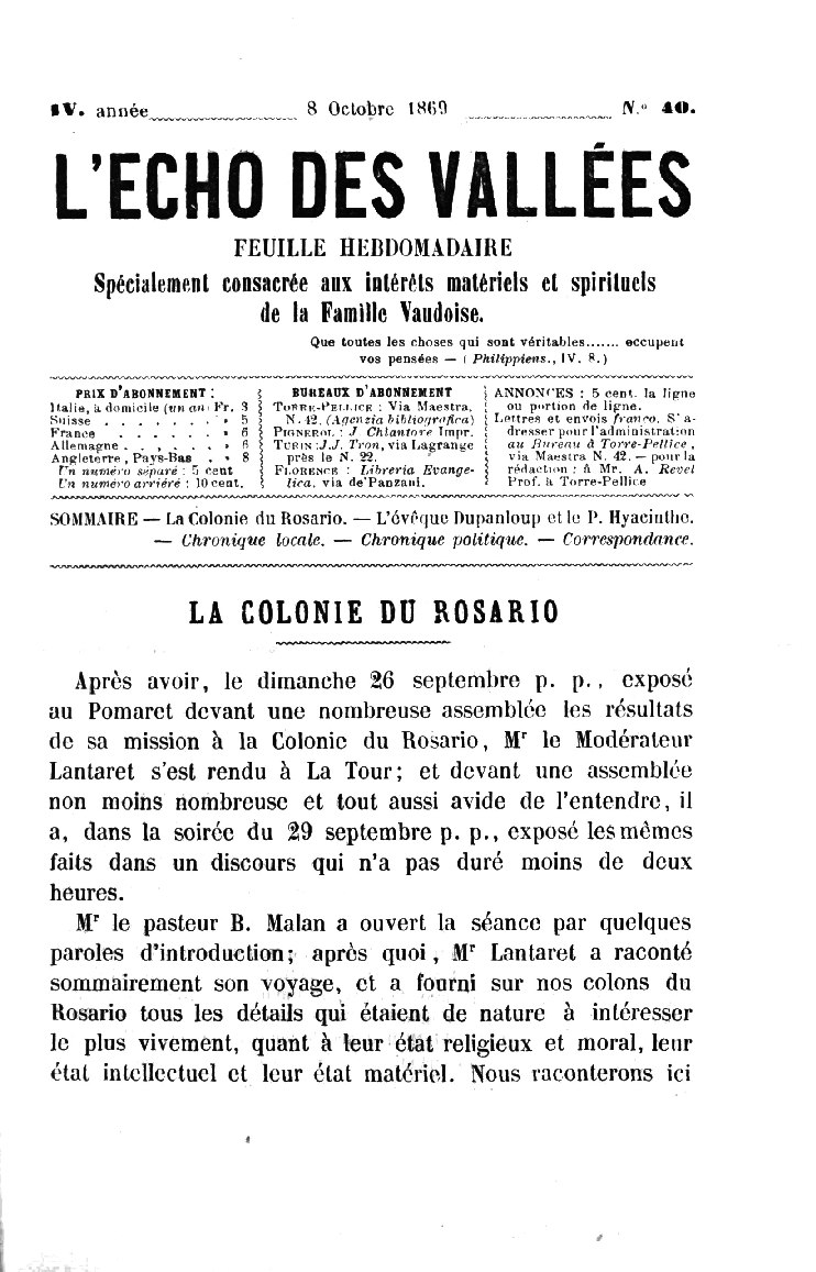 Torre-Pellice, 3 ottobre 1869. U Ufjiciale dello Stato Civile