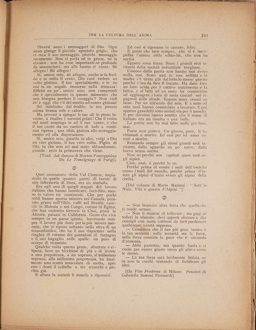 Soltanto dopo una faticosa marcia del pensiero; povero pensiero che ha camminato per anni e anni con lo zaino sulle spalle e il fucile a tracolla! Non ha trovato quasi mai una buona fontana d’acqua viva e fresca a cui dissetarsi (la fontana della nostra sete sul Carso: la neve dell’altopiano); sempre avanti sotto il sole con la sua faccia pallida di malato e di nevrastenico.