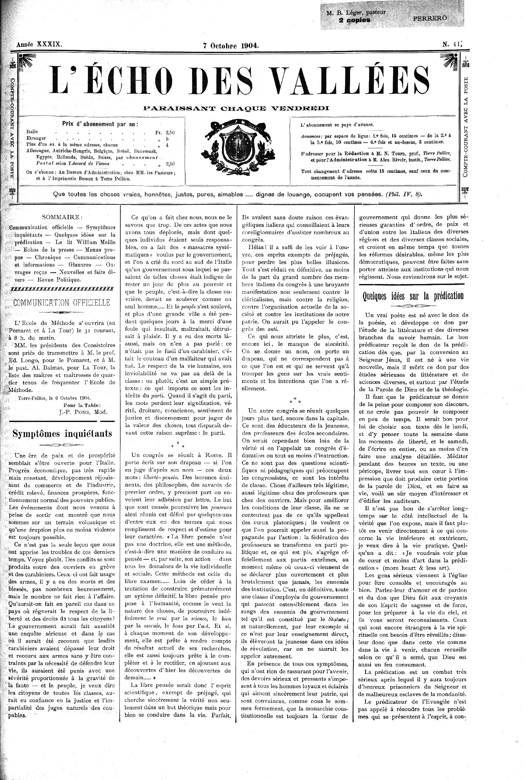 Torre-Pellice, le 6 Octobre 1904.