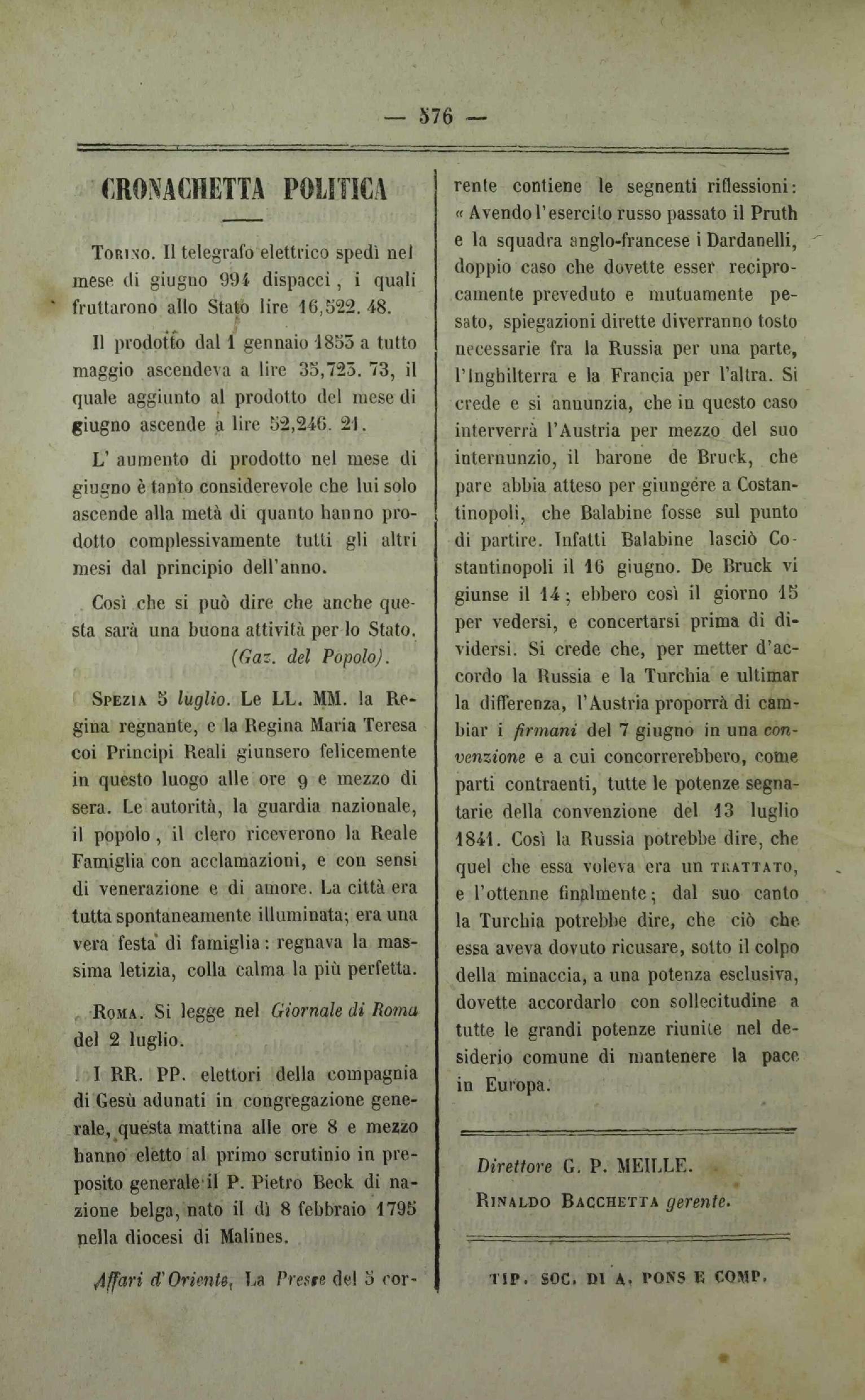 Il Talbet, giornale clericale, dà i particolari intorno alle spese fatte dal I).