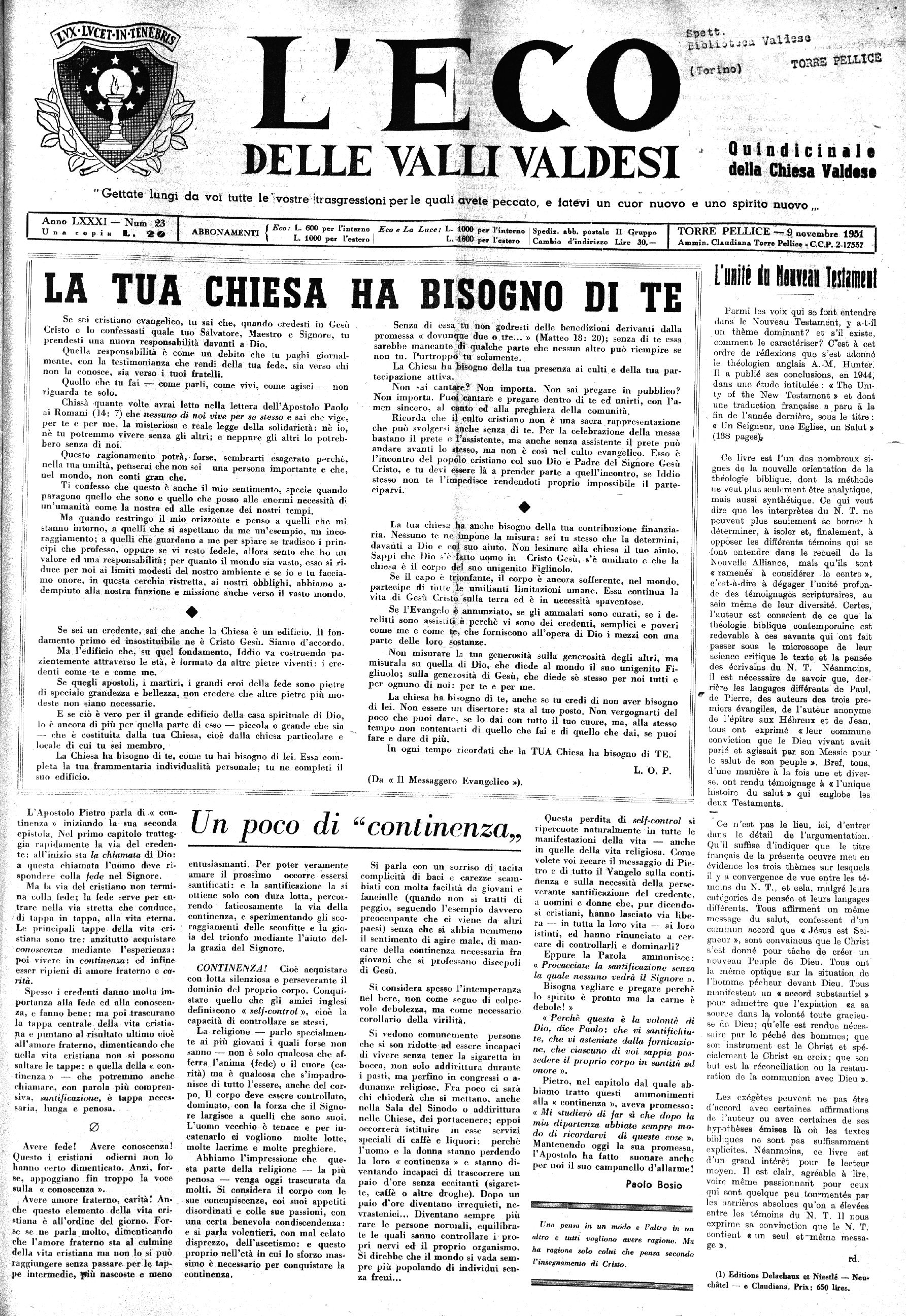 Spediz. abb. postale II Grappo | TORRE PELLICE — 9 novembre 19M