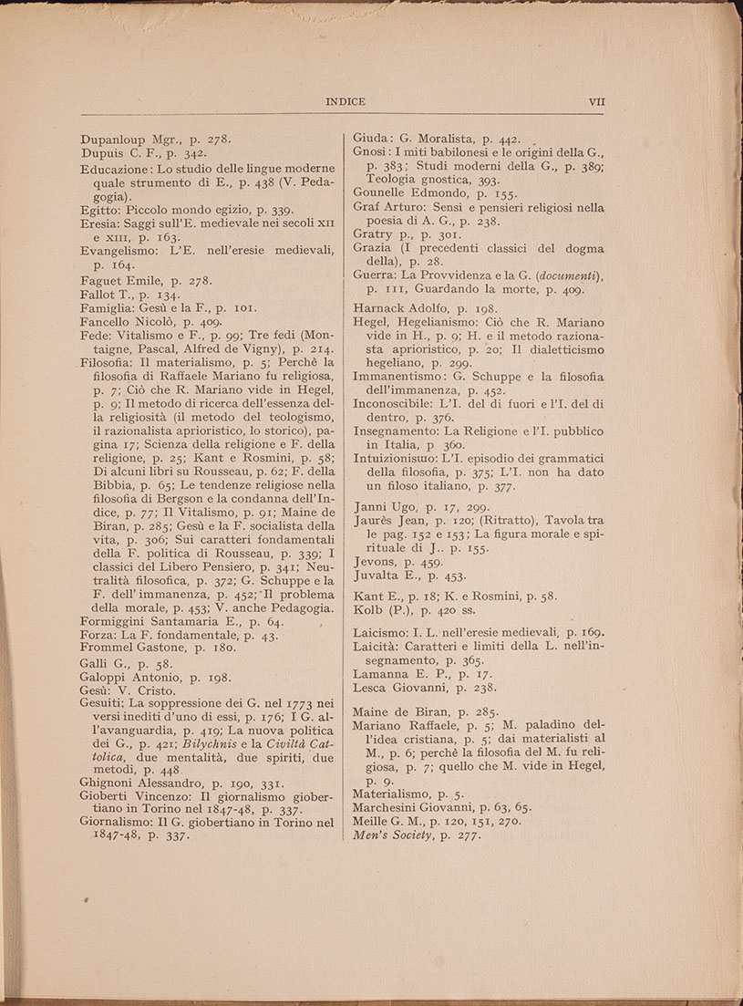 Sociologia: LaS. di Gesù, p. 101, 305; Le origini cristiane del Pacifismo contemporaneo, p. 131; Lettere di un cristiano-sociale p. 134; Come si diventa cristiani-sociali o magari socialisti-cristiani, p. 270; La lotta e la condanna contro il sindacalismo cattolico, p. 426.