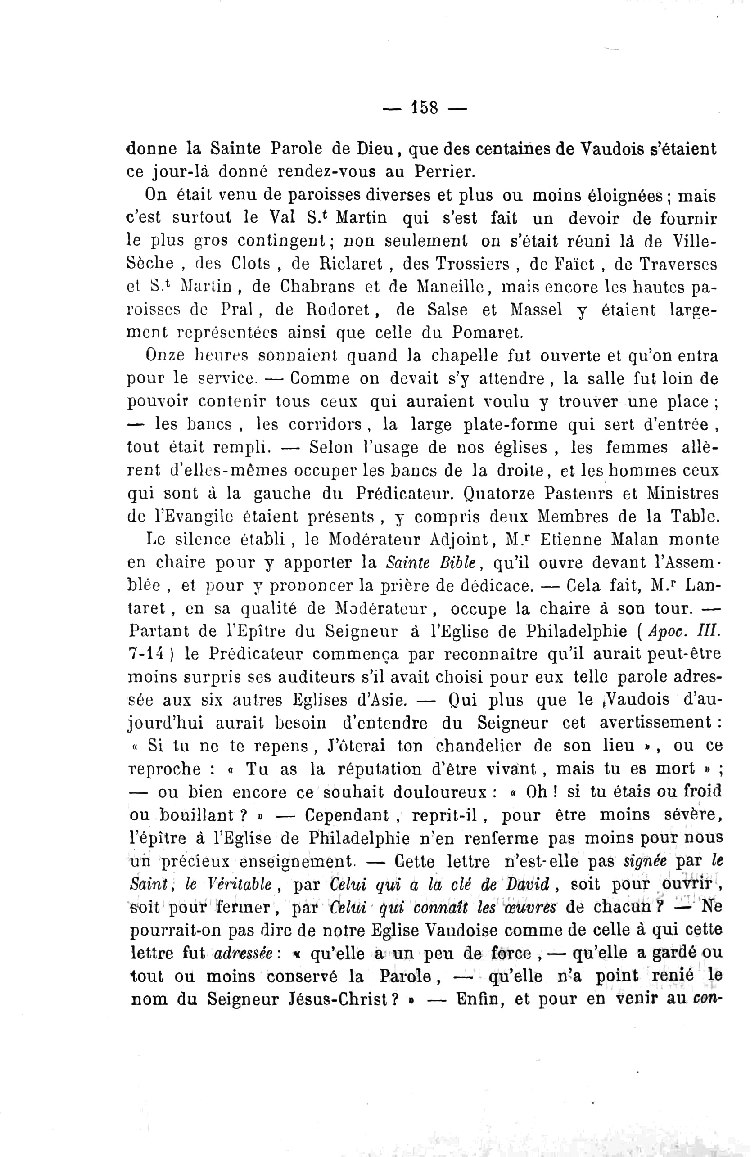 moins surpris ses auditeurs s’il avait choisi pour eux telle parole adressée aux six autres Eglises d’Asie. —- Qui plus que le ,Vaudois d’aujourd’hui aurait besoin d’entendre du Seigneur cet avertissement :