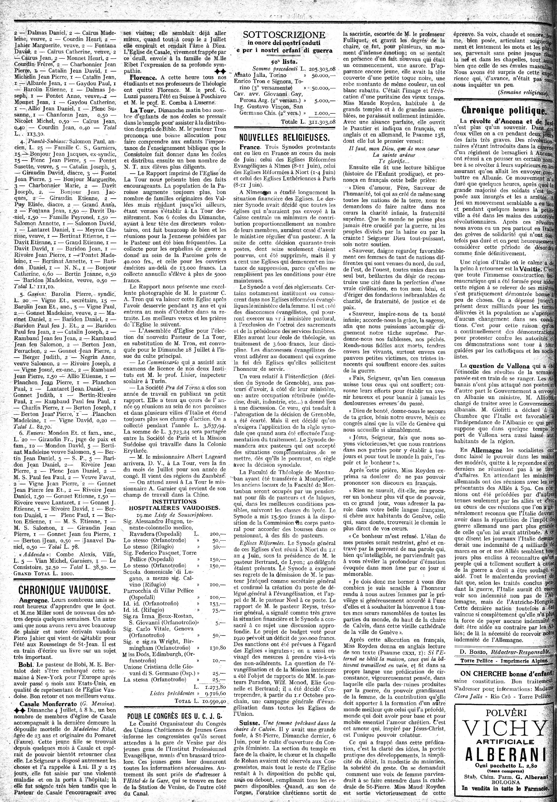 S’adresser pour la Rédaction à M. David Bosio, pasteur, Torreet pour